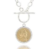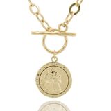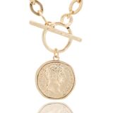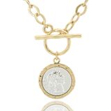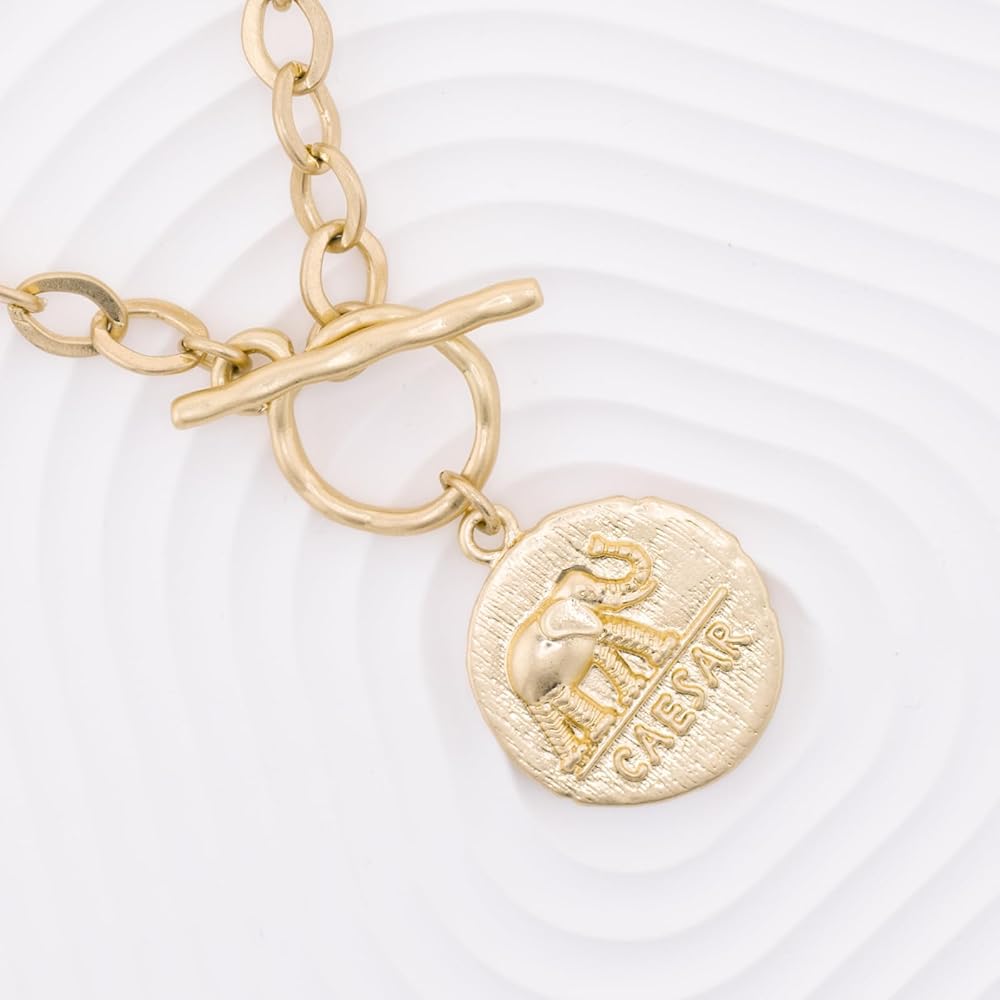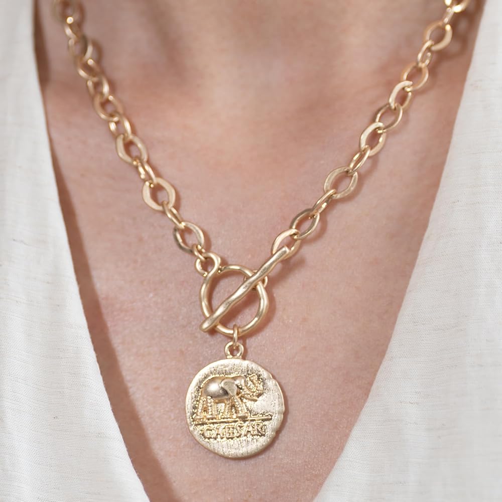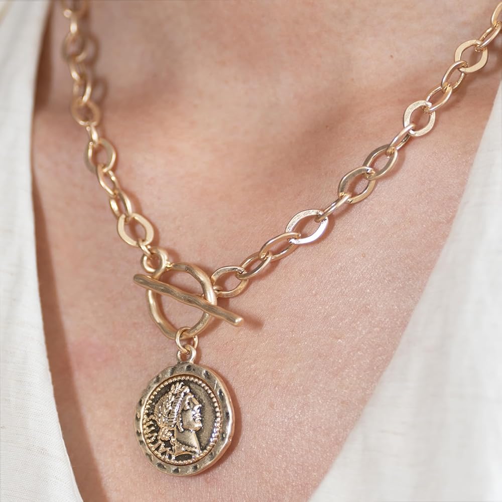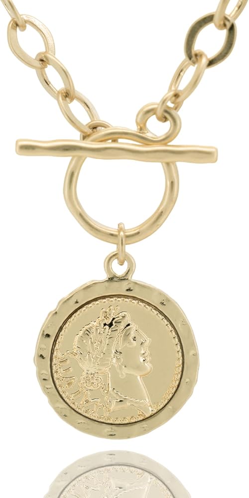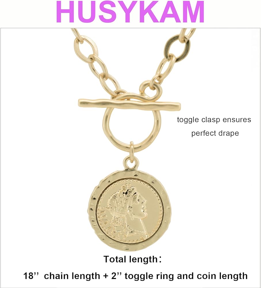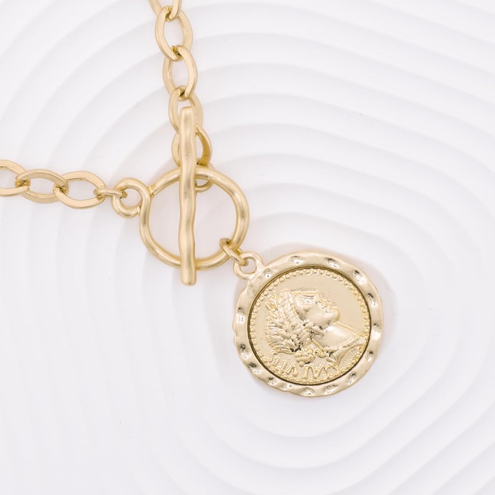 【Unique Design】- This necklace features a distinctive coin pendant with intricate antique patterns on both sides, blending vintage charm with modern style. Crafted as a signature statement piece on an 18-inch toggle chain.