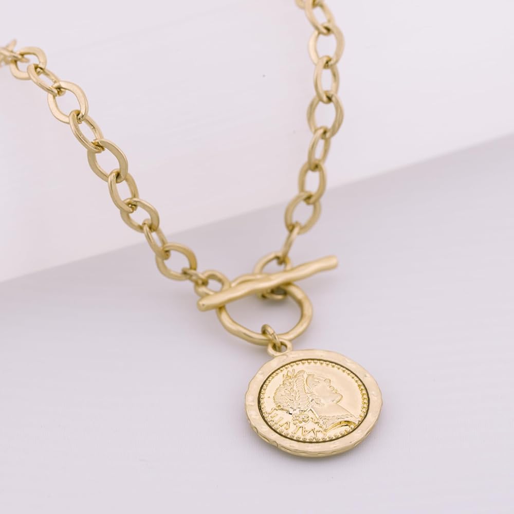 Chunky Coin Antique Gold Plated Thick Link Chain Layered Pendant Necklace for Women 18 Inch Trendy Toggle Chain Necklace Gift for Women