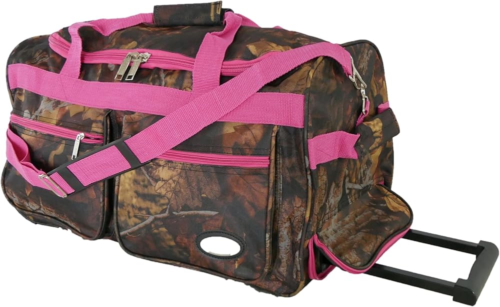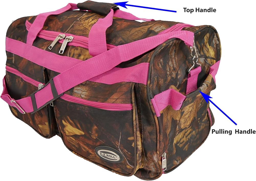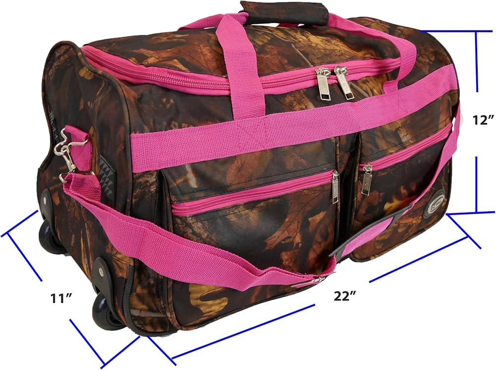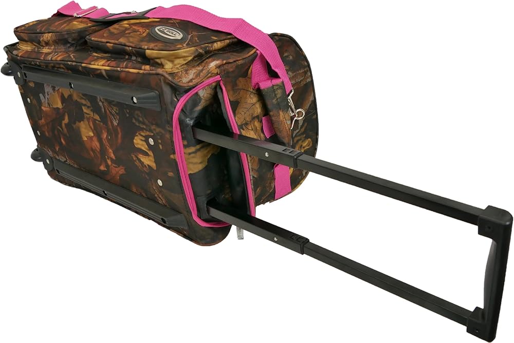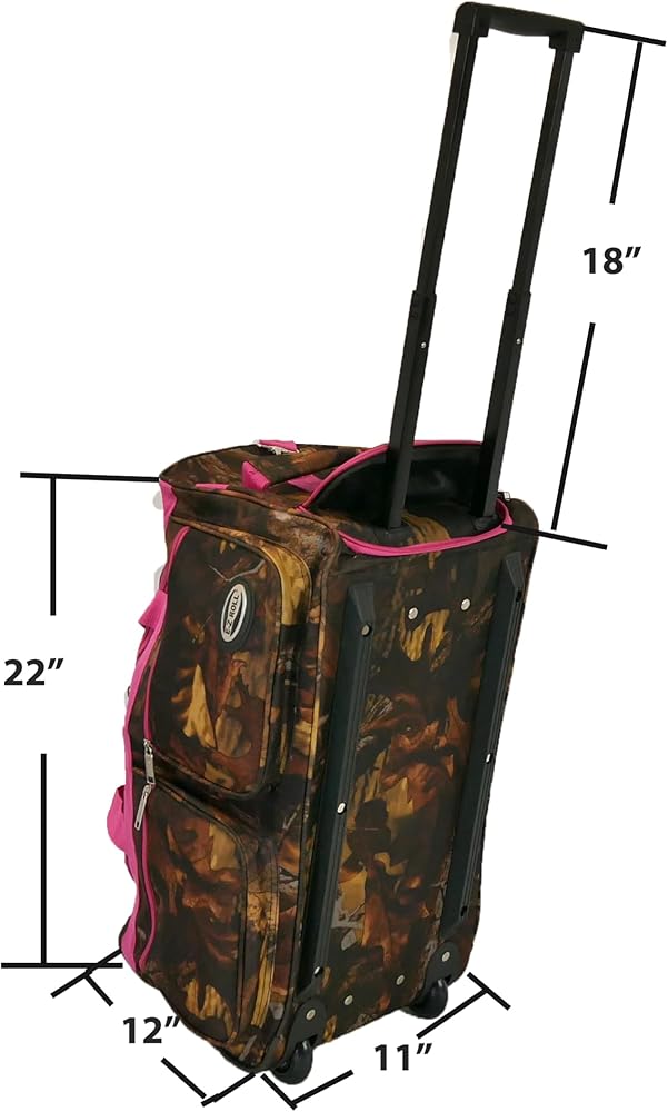 This Carry-on size (Cabin Friendly) camouflage soft-sided rolling duffle bag is constructed with durable polyester material with waterproof PVC coating water resistant ,wide open U-shape top opening , there are hidden aluminum retractable telescoping handle and a soft pulling handle,2 in-line wheels provide sturdy and smooth mobility,2 large front pockets and an adjustable/detachable shoulder strap. This bag's great packing capacity, it's perfect to use it for hunting, hiking, camping, travel, sports,etc. also can be used to pack outdoor equipment.
