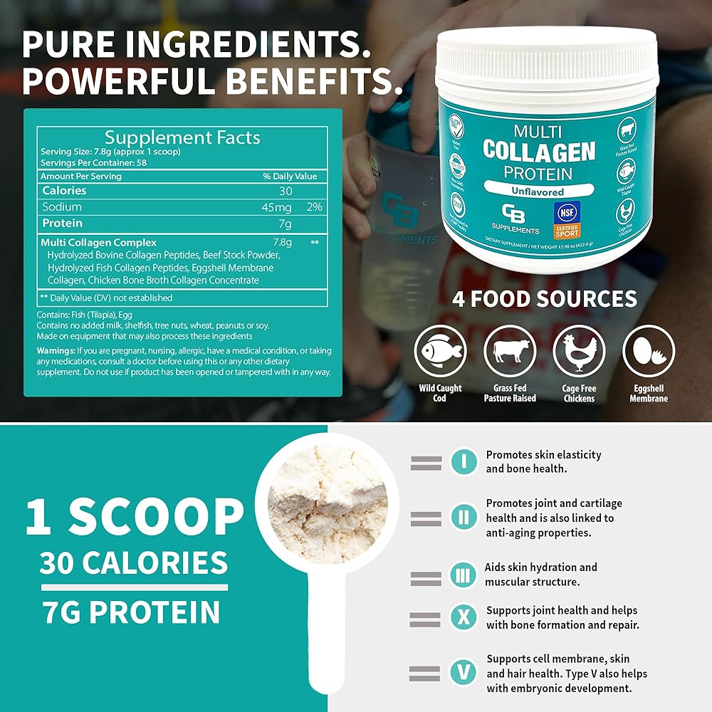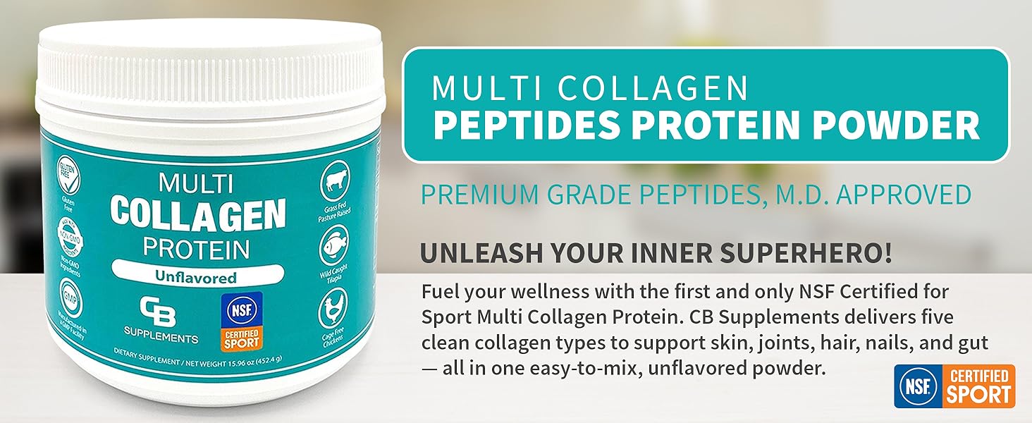 مكملات CB المعتمدة من NSF للرياضة، مسحوق بروتين الكولاجين المتعدد لدعم العظام والجلد والشعر والمفاصل | مكملات الكولاجين المتحللة (58 حصة (عبوة من 1)، بدون نكهة)