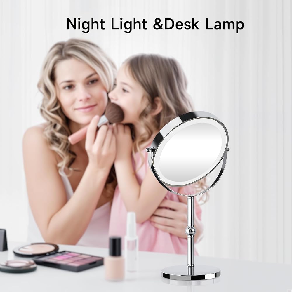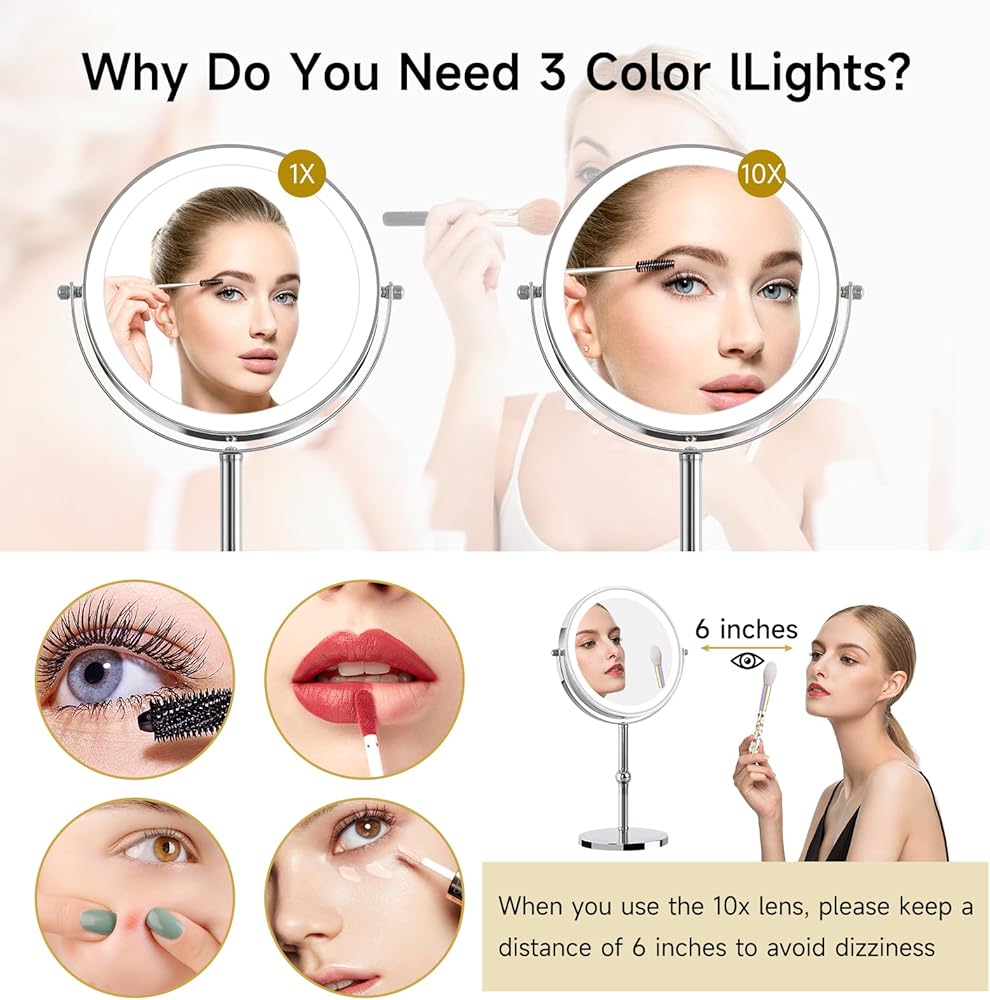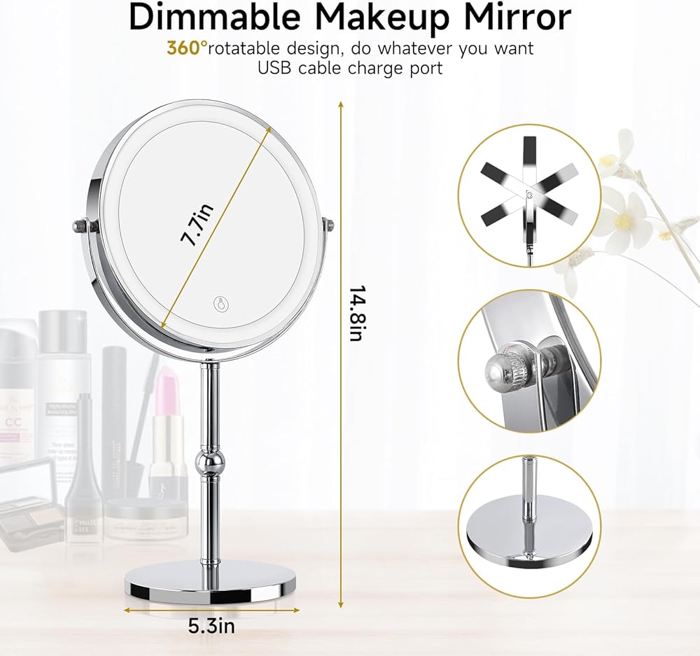 مرآة مكياج مضيئة بأضواء أكثر سطوعًا، مرآة زينة مكبرة عالية الدقة 1x/10xTrue HD مع تحكم باللمس، مرآة مزدوجة الجوانب قابلة لإعادة الشحن بزاوية 360 درجة مع 3 أضواء خافتة للضوء