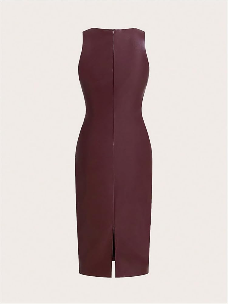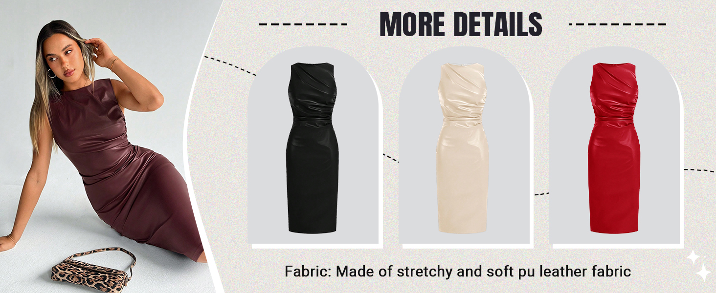 - المزايا: مكشكش، بدون أكمام، رقبة دائرية، ظهر مقسوم، سحاب خلفي، جلد البولي يوريثان، فستان متوسط الطول بوديكون