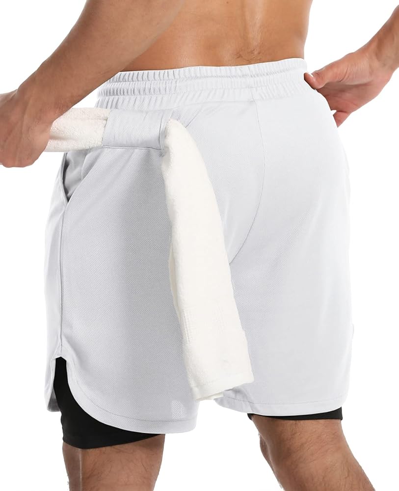 تصميم متعدد الوظائف: هذا الشورت الرياضي الرجالي مع حلقة منشفة مرفقة أسفل حزام الخصر الأيسر. يسمح لك بتعليق المنشفة أثناء التمرين بشكل أكثر راحة. الطبقة الداخلية بها جيب عميق للهاتف. الطبقة الخارجية بها جيبان جانبيان وجيب واحد غير مرئي بسحاب.