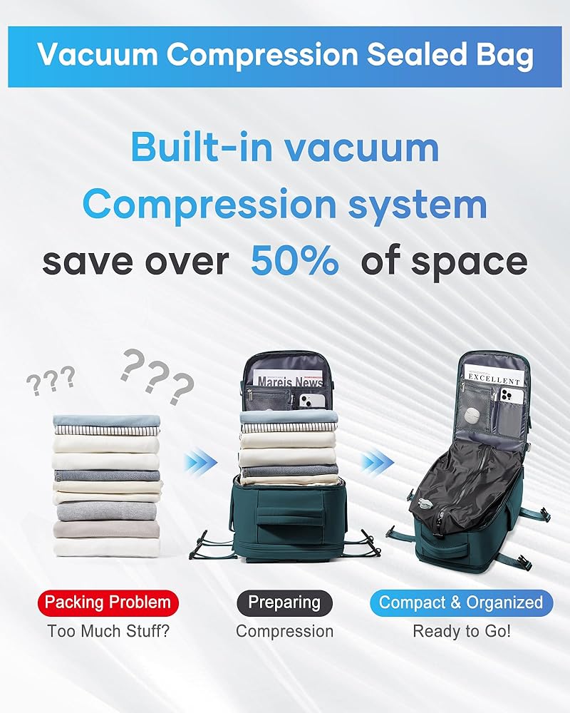 حقيبة ظهر Vacpack مع حقيبة ظهر بختم مفرغ، حقائب ظهر للسفر مع مضخة، حقائب ظهر للسفر، حقيبة ضغط للرجال، تحمل على حقيبة الطيران المعتمدة للنساء في عطلة نهاية الأسبوع والمشي لمسافات طويلة، حقيبة نهارية للعمل باللون الأزرق الطاووس