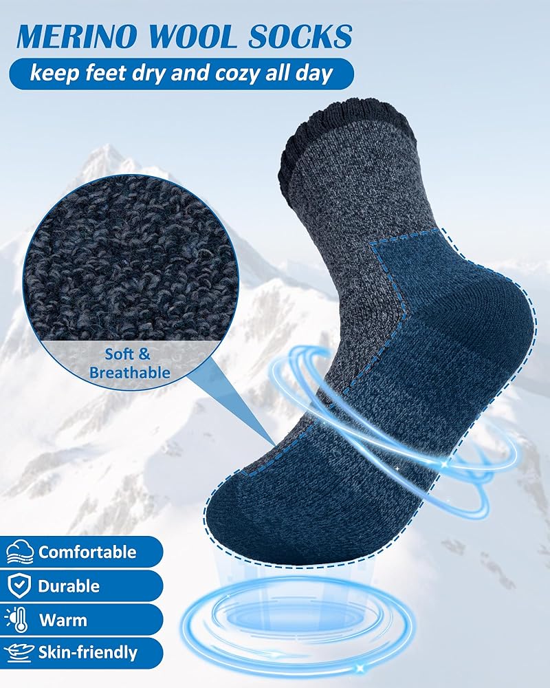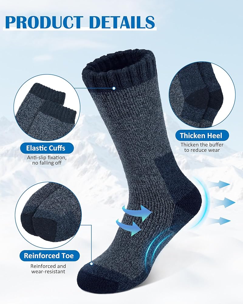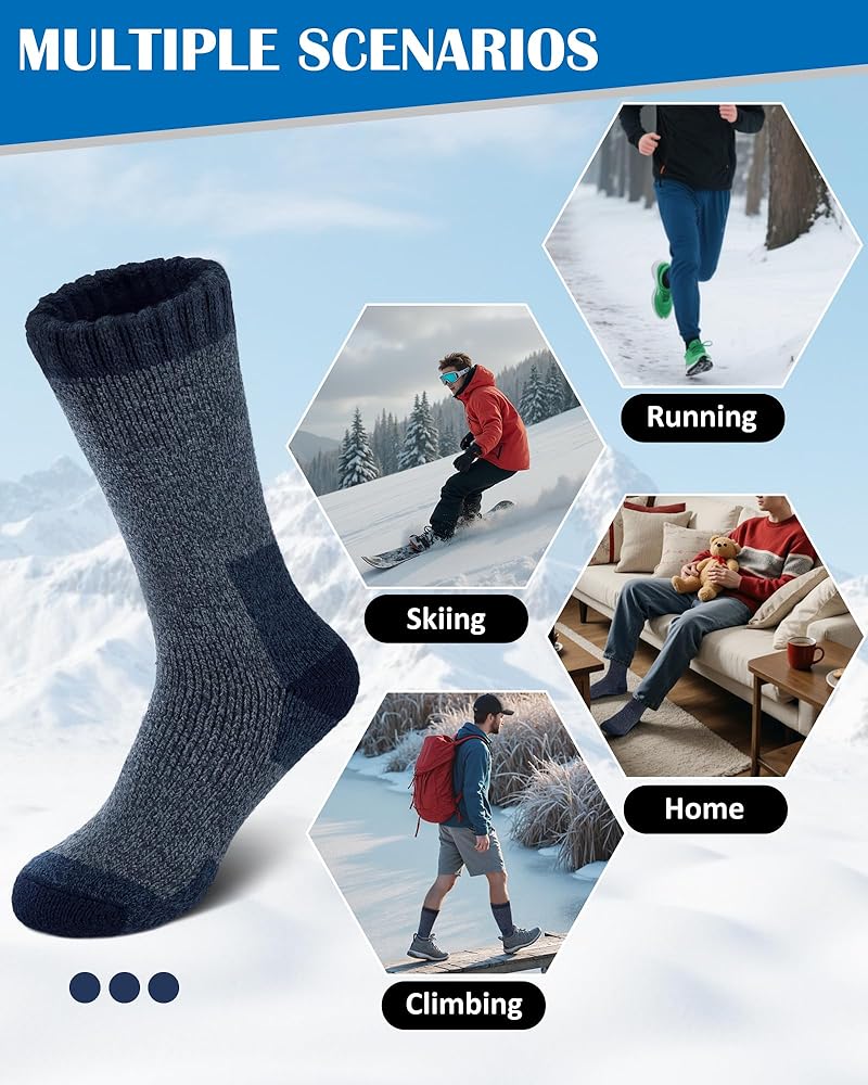 Thick socks for men are made from 68%Merino Wool, 15%Polyester Fibre, 12%Viscose and 5%Spandex;