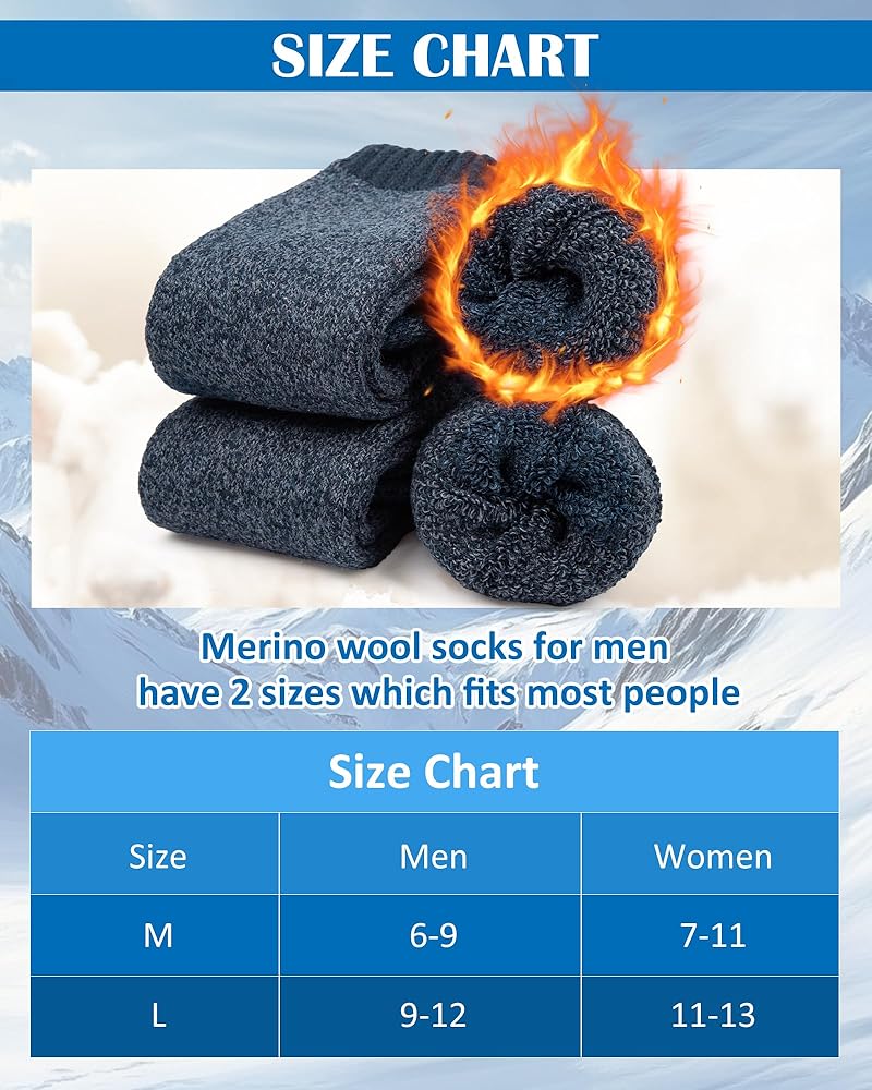 We offer various sizing options, thick socks for men come in shoe sizes US 6 - 9 and 9 - 12, ensuring a good fit for all