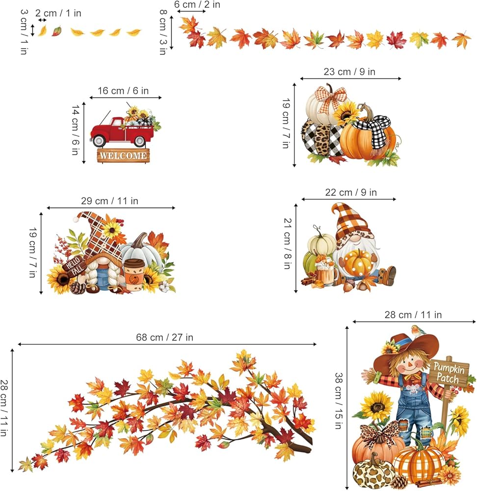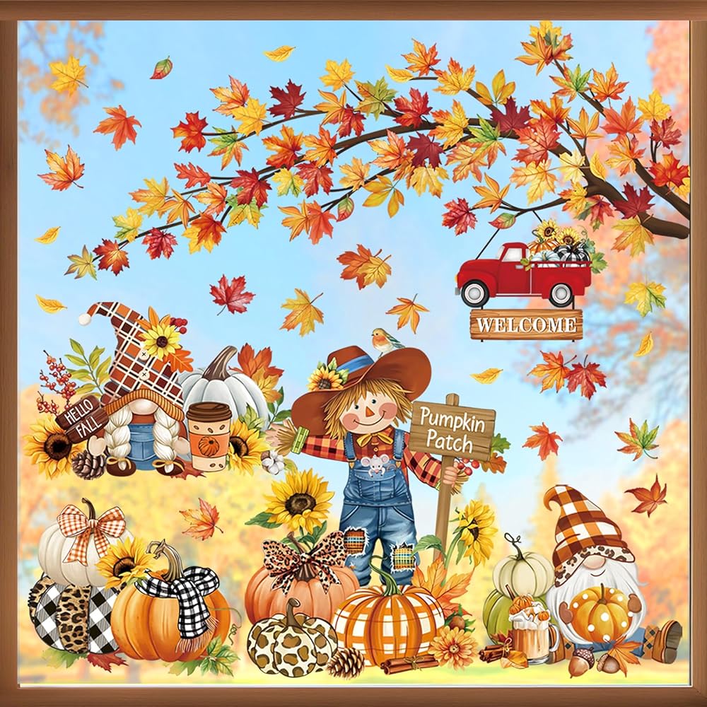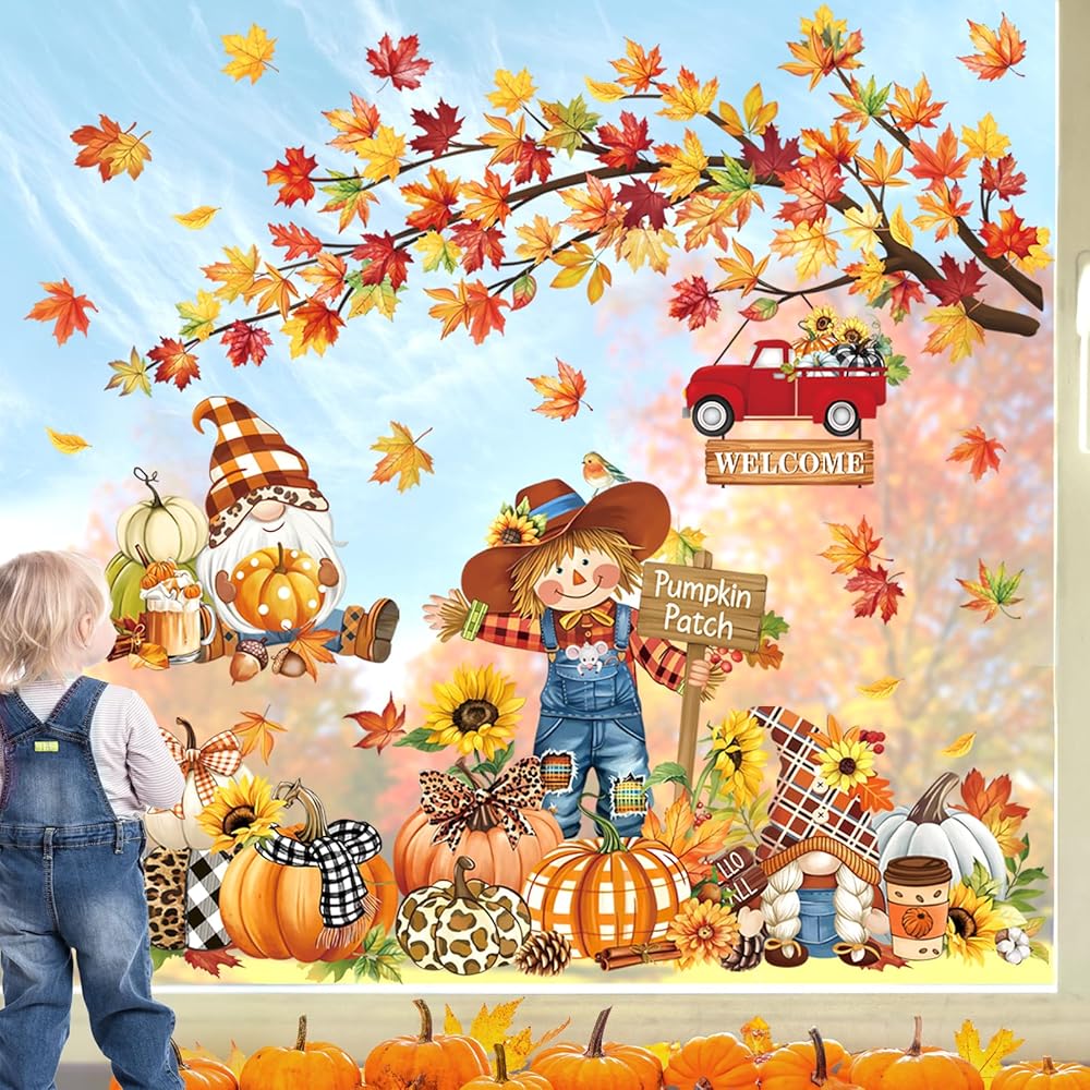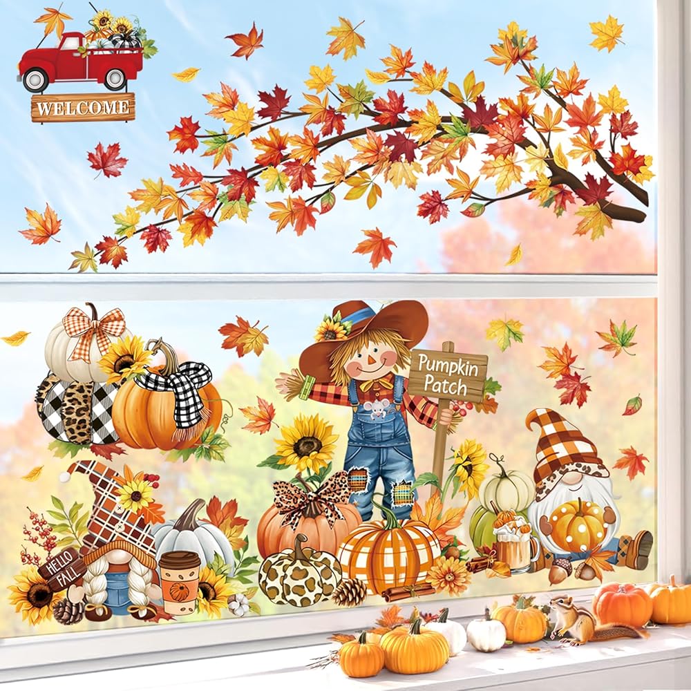 تعتبر Decalmile Fall Pumpkin Orects Double -Side Window Clings مثالية لتزيين المرايا الداخلية وبقع الزجاج (يرجى ملاحظة أنها لن تتشبث بالجدران). يمكن استخدامه في ديكور المنزل ولكن أيضًا في المتاجر والمكاتب والصالونات