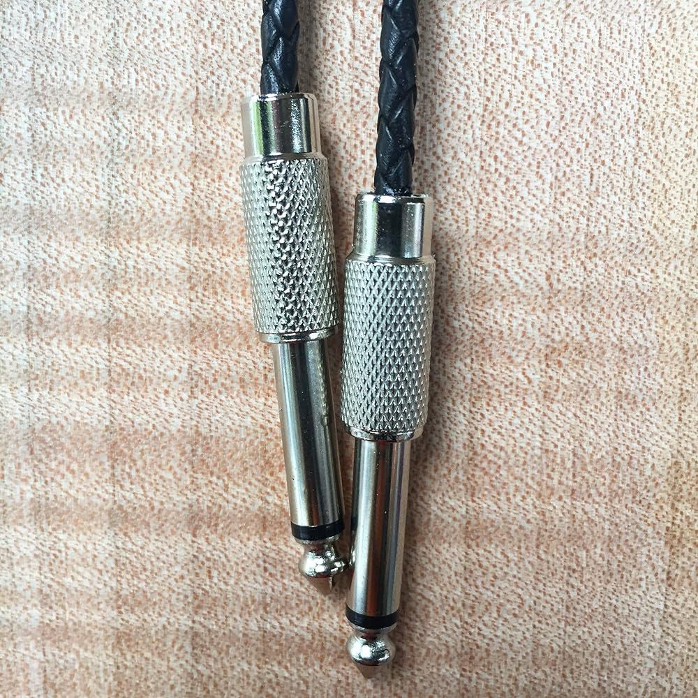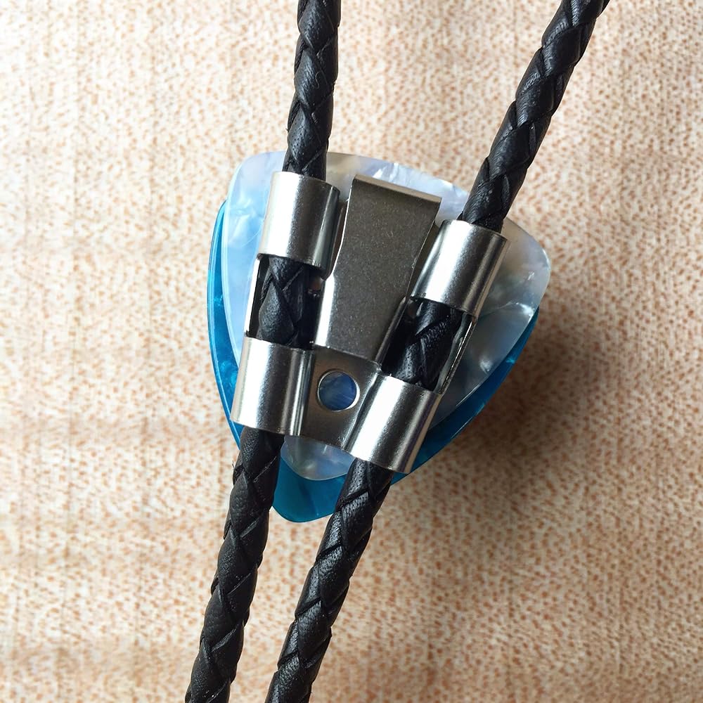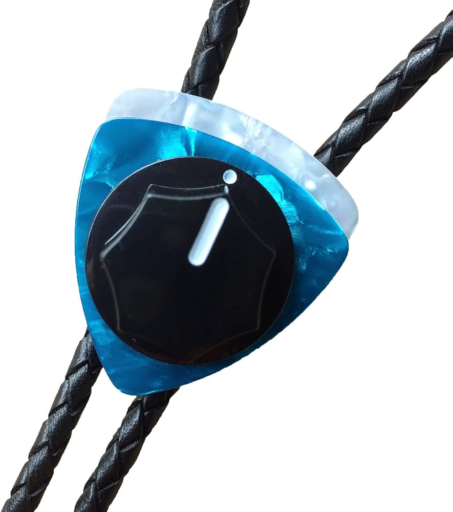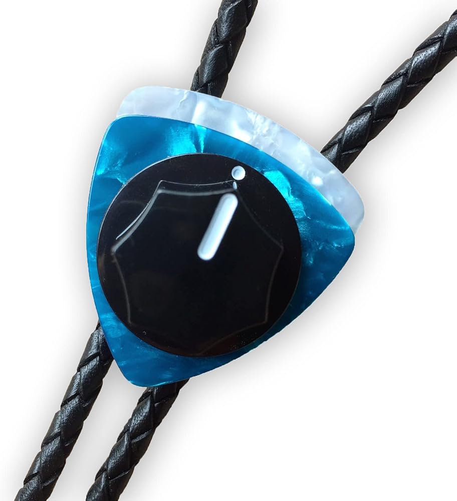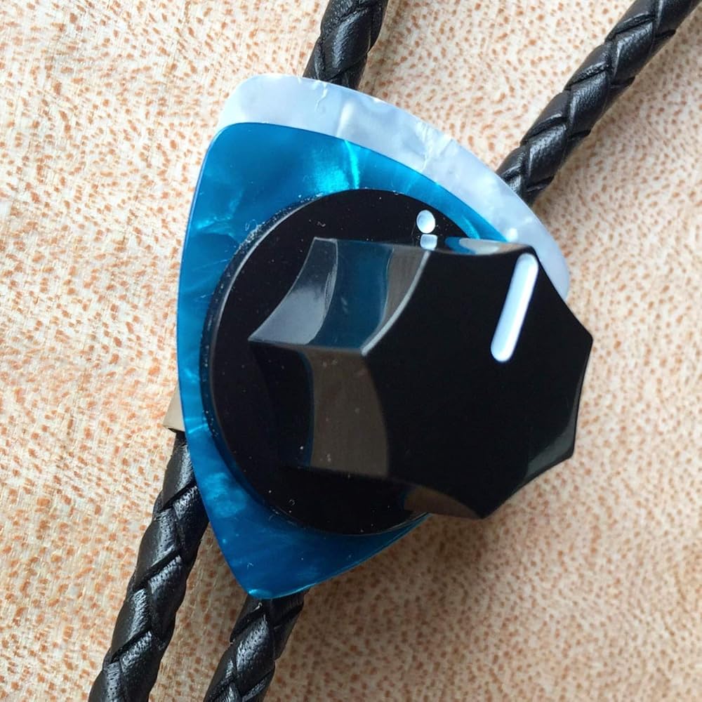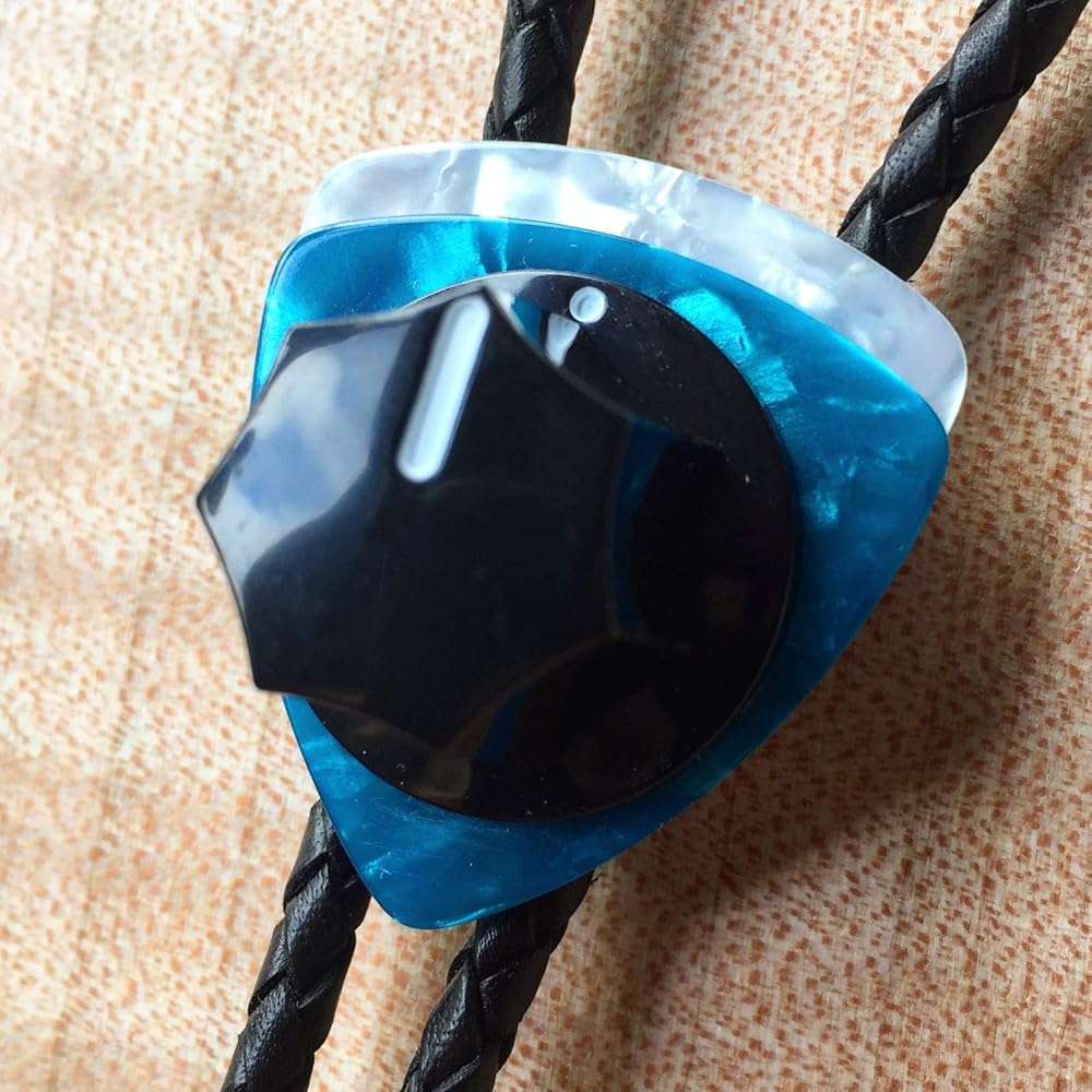 Whether you're a musician or not, this Fender knob bolo tie could be yours. But you'd have an even better appreciation as a guitar or bass player. Imagine gigging, going to a party or a show wearing this. There's something so cool about this bolo tie. Definitely not a cowboy or string tie. And it's not like any average Joe would have one. Women have bought one of these for themselves as well. Very chic and original. The components of this Fender Knob Bolo Tie: I start with a beautiful vintage type guitar knob made for specifically for Fender guitars and basses and place it on a couple of beautiful celluloid guitar picks. I attach these to a tension bolo back for ease of adjustment. This bolo back also won't scar and fray the beautiful, braided leather cord that goes through it when adjusting. The black braided leather is a perfect 4 mm. in diameter. I finish it off with cable ends ... the kind you'd plug into an amplifier, after drilling them out to make room for the leather cord.