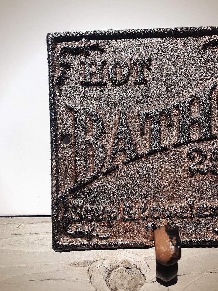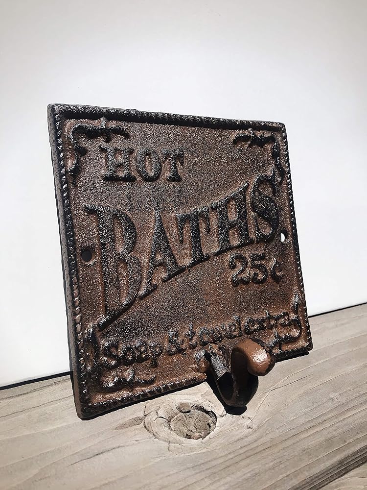 القياسات: علامة الحمام Hot Bath Farmhouse ذات خطافات زخرفية بقياس 5.5 بوصة × 5.5 بوصة. يمتد الخطاف 2 بوصة من الحائط ويبلغ عمقه 1.5 بوصة. يتم تضمين البراغي المطابقة للتركيب السلس.