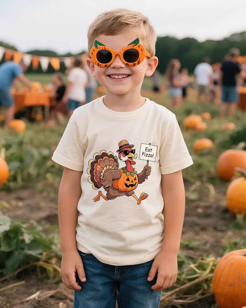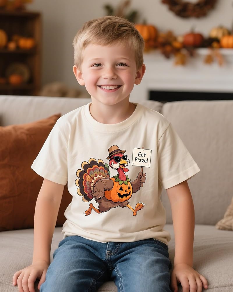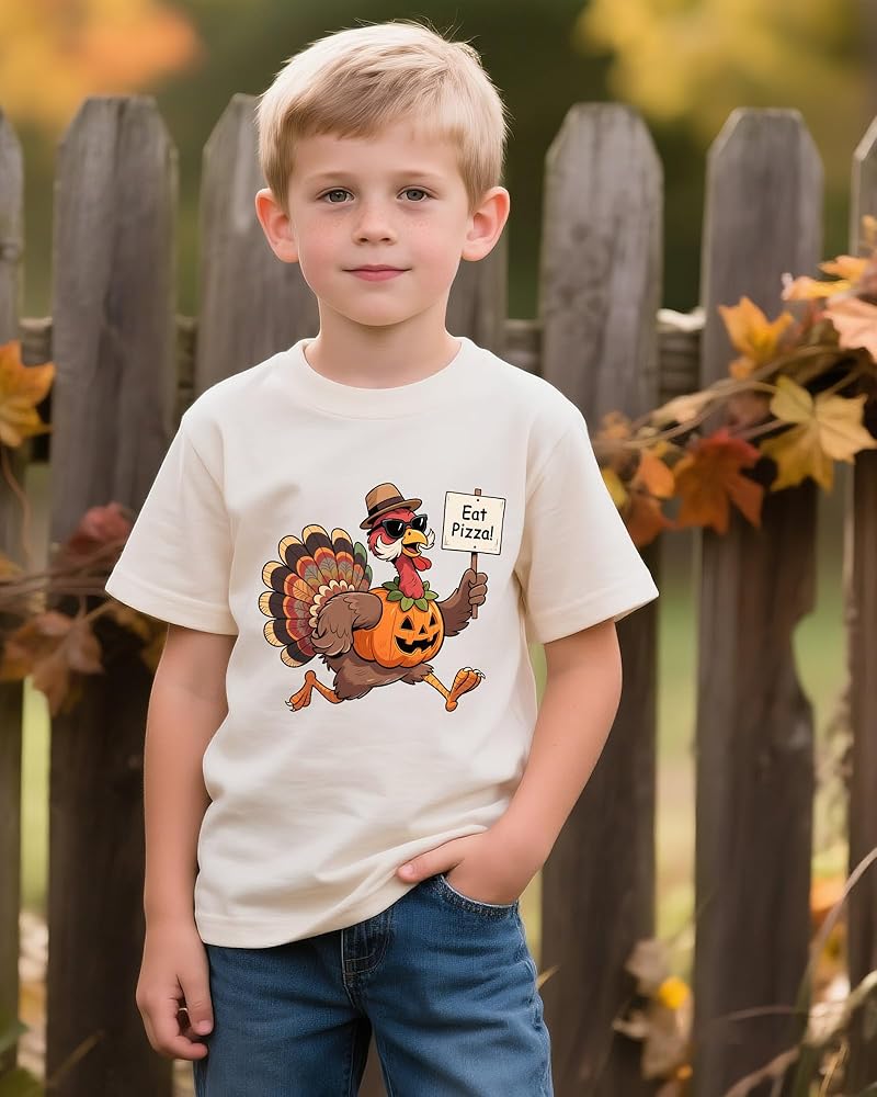 Funny Design: Adorable Thanksgiving-themed turkey shirts featuring playful sayings like "Gobble Gobble Gobble," "Gobble Till You Wobble," "Eat Pizza," and "Mr. Steal Your Pie." Perfect for kids, boys who love a fun holiday look!