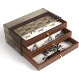 صندوق مجوهرات بأدراج خشبية من 3 طبقات منظم مجوهرات على الطراز العتيق مع غطاء أكريليك، صندوق عرض لتخزين المجوهرات لأقراط الخاتم وقلادة وصندوق السوار للنساء والفتيات (لون الجوز) (أ) in Kuwait