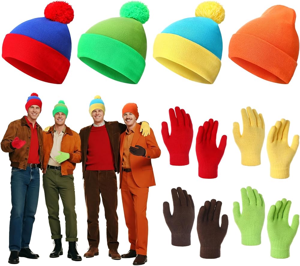 Squad Coordination: unite your group with this Halloween character cosplay set, featuring 4 exclusive beanie hats and gloves-a blue cap pairs with red gloves, a green cap with green gloves, a yellow winter cap with black gloves, and an orange cap with brown gloves, capturing each character's essence perfectly