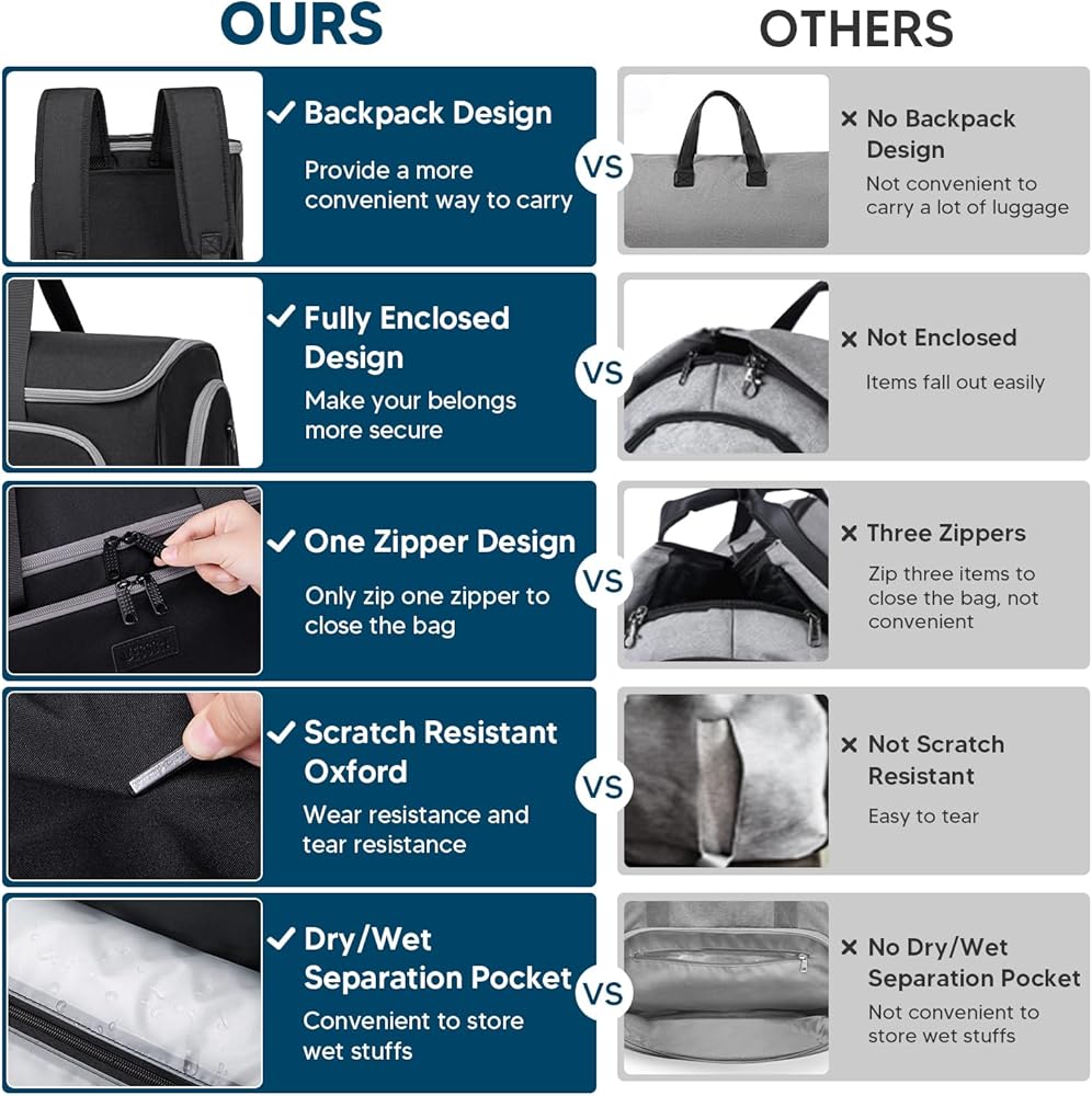 【متينة ومقاومة للماء】 حقيبة ملابس السفر مصنوعة من نسيج بوليستر عالي الجودة، وهو مقاوم للخدش، ومقاوم للتمزق، وخصائص مقاومة للماء. يتميز بسحاب معدني آمن غير قابل للانزلاق ومجهز بمقابض مريحة بالإضافة إلى حزام كتف مبطن وقابل للتعديل والإزالة.
