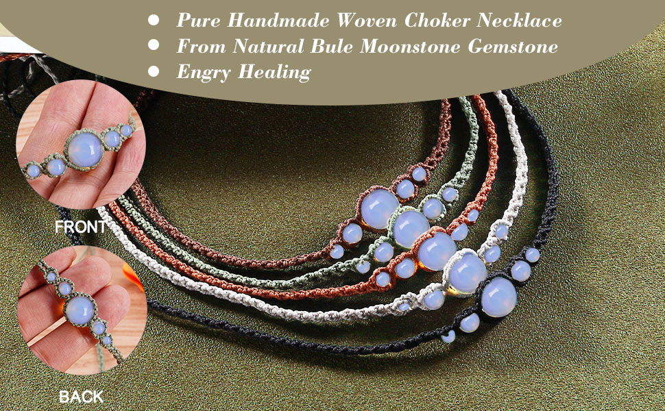 القلائد المصنوعة يدويًا: كل قلادة منسوجة يدويًا بالحب والبركة. تم نسج 5 أحجار قمر داخل القلادة لتشكيل قلادة ضيقة بسيطة للنساء، وتم نسج حجر قمر واحد في نهاية القلادة لتعزيز القلادة وضبط طول القلادة.