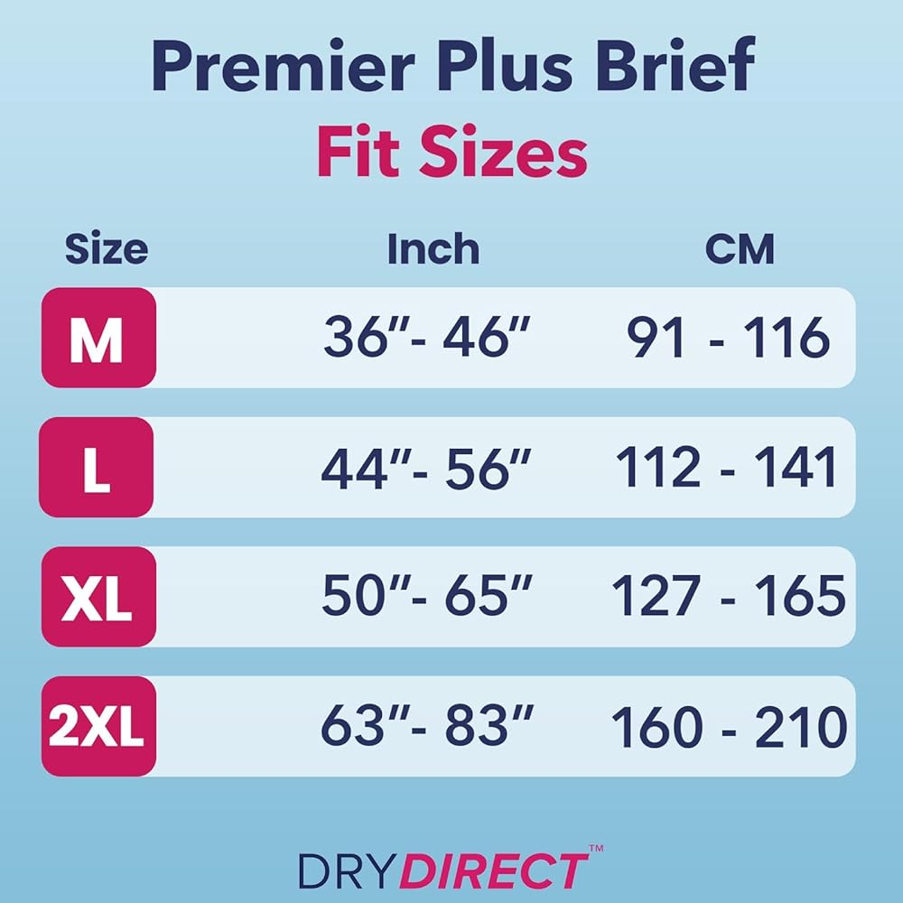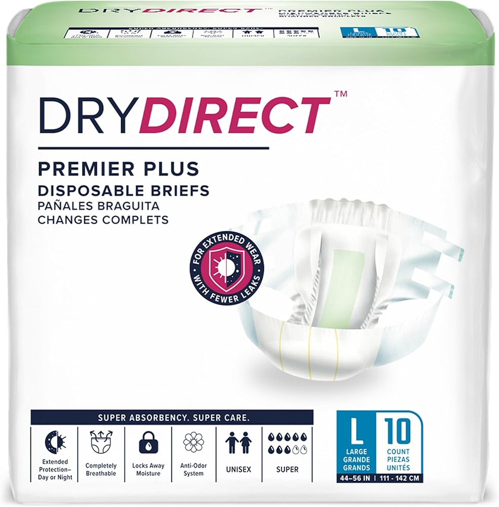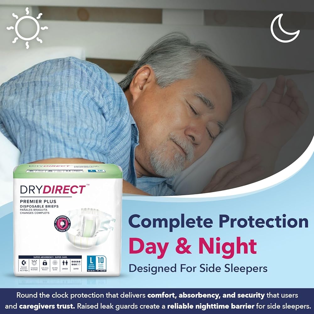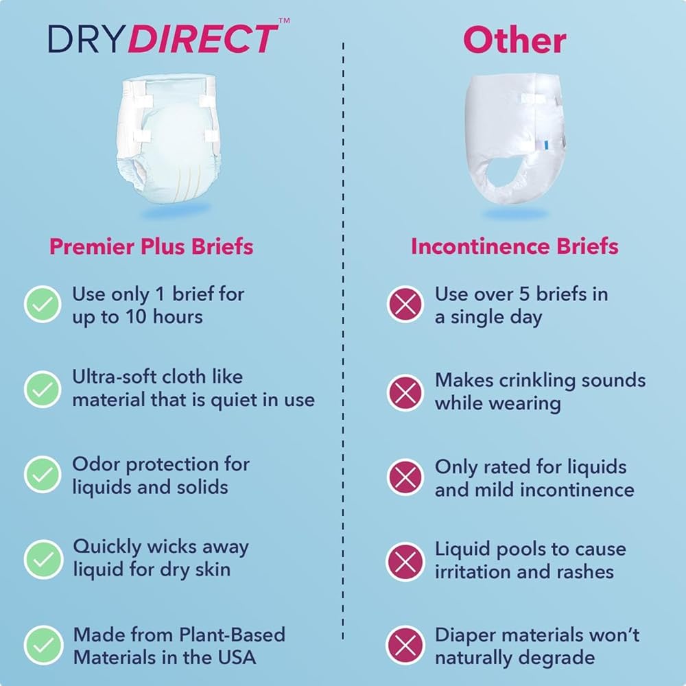 Dry Direct Premier Plus Disposable Briefs provide reliable protection. Soft and gentle on skin, with a super absorbent core that locks in moisture and controls odor. Breathable materials, soft leak guards, and refastenable tabs ensure a secure, and comfortable fit for extended wear. Designed for discreet support day or night, especially for those with limited mobility.