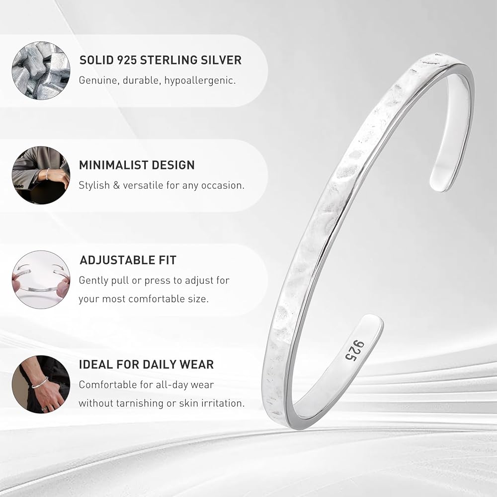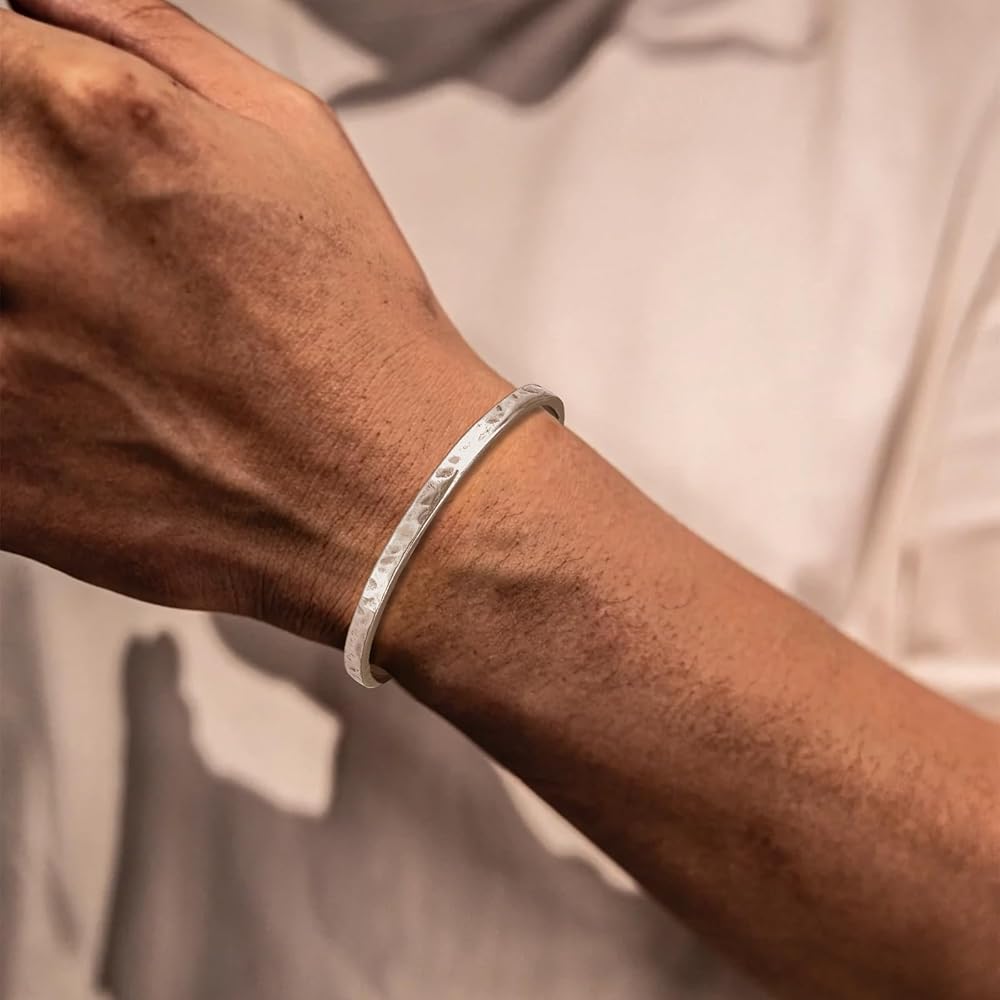 [سوار من الفضة الإسترلينية المطروقة] هذه الأساور المطروقة يدويًا مصنوعة من الفضة الإسترلينية الأصلية عيار 925. خالية من النيكل والرصاص والكادميوم، فهي لا تسبب الحساسية ومثالية للبشرة الحساسة. مقاومة للتشوه وقابلة للتعديل بسهولة، وهي الخيار الأمثل للارتداء اليومي المريح والأنيق