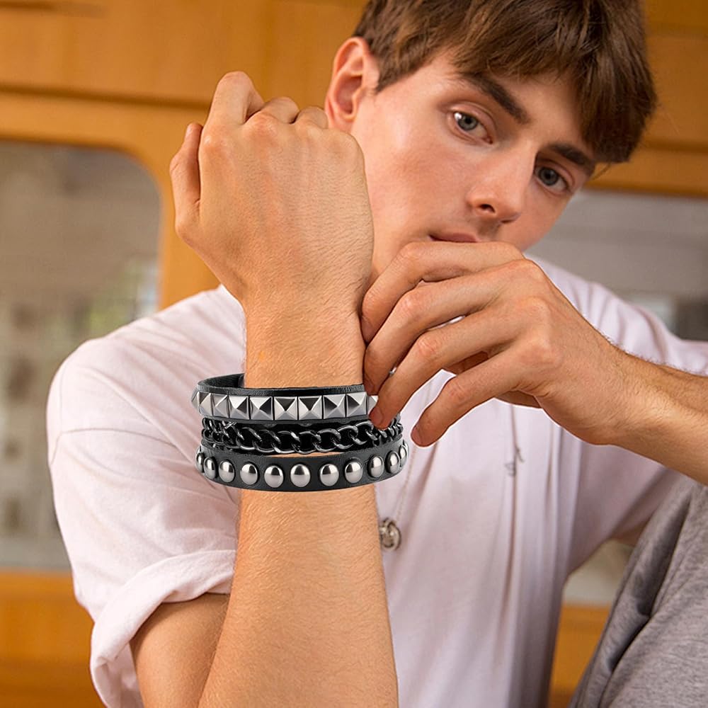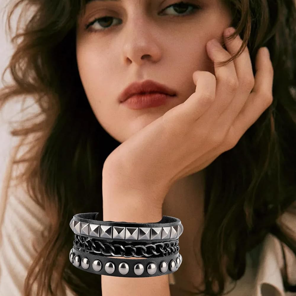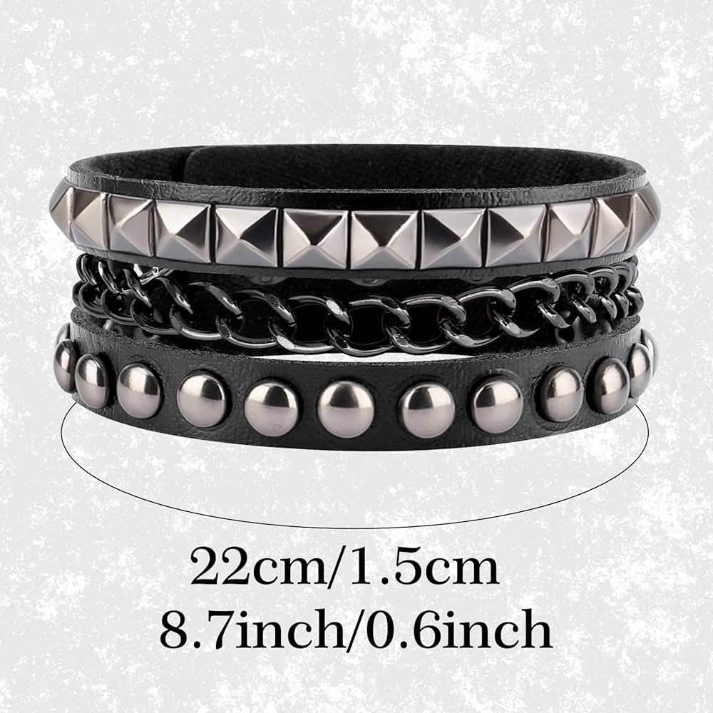 سوار جلدي للرجال: 3 أساور جلدية للنساء متضمنة في العبوة، كل سوار جلد رجالي له نمط مختلف، يمكنك اختيار أساور مرصعة مختلفة وفقًا للملابس المختلفة مع ملابس مختلفة، يمكنك ارتداء سوار واحد للنساء بمفردهن أو أساور متعددة من الإيمو في نفس الوقت، ويمكن أيضًا مشاركة كميات متعددة من الأساور القوطي مع الأصدقاء.