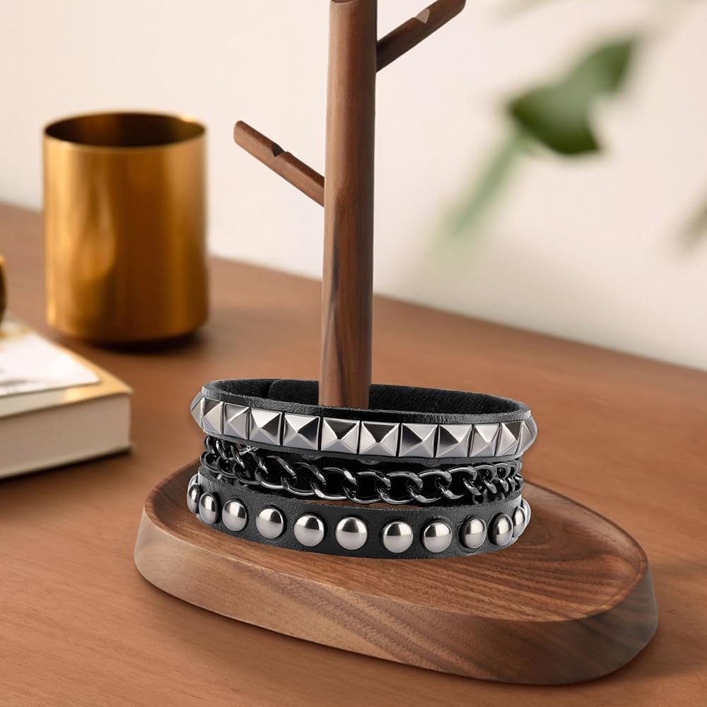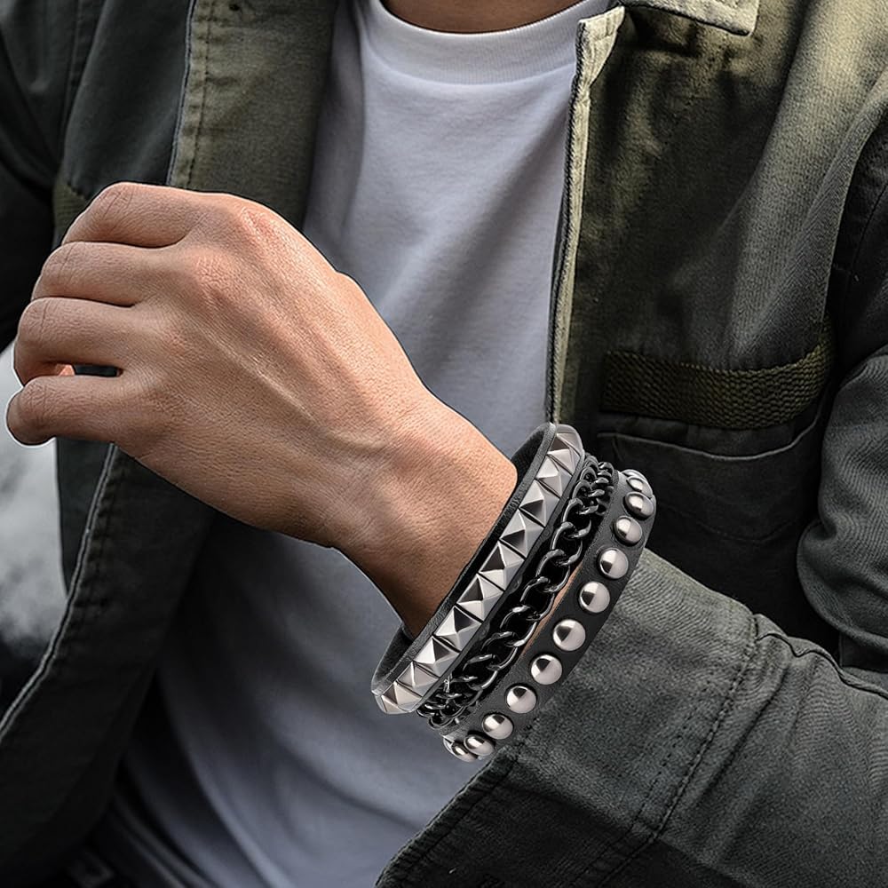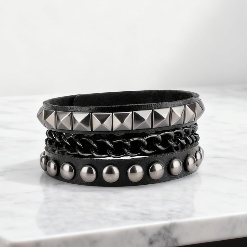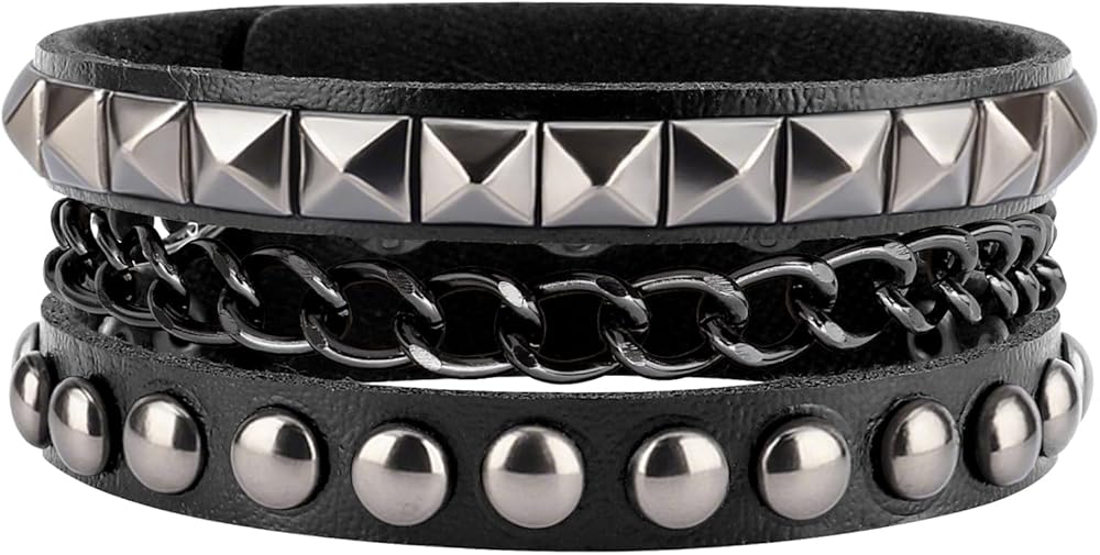 سوار جلدي للرجال: 3 أساور جلدية للنساء متضمنة في العبوة، كل سوار جلد رجالي له نمط مختلف، يمكنك اختيار أساور مرصعة مختلفة وفقًا للملابس المختلفة مع ملابس مختلفة، يمكنك ارتداء سوار واحد للنساء بمفردهن أو أساور متعددة من الإيمو في نفس الوقت، ويمكن أيضًا مشاركة كميات متعددة من الأساور القوطي مع الأصدقاء.