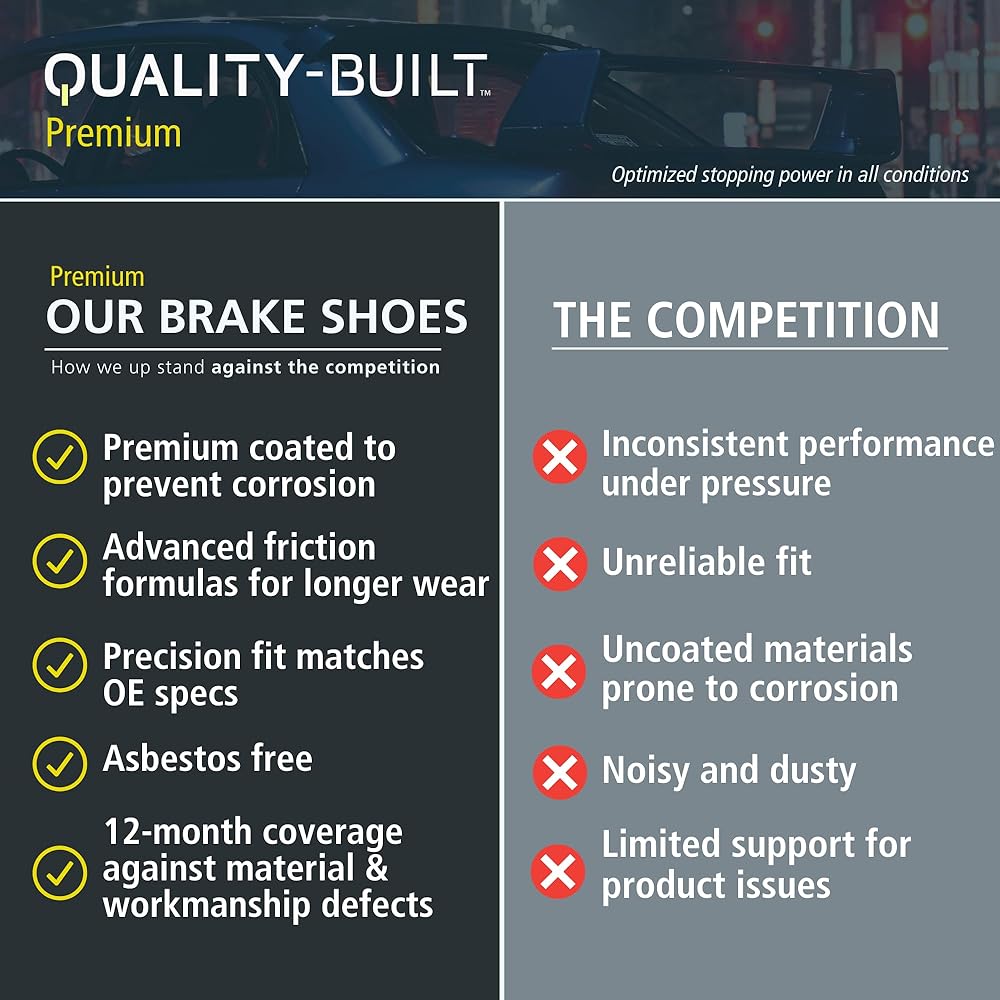 QUALITY-BUILT Premium brake shoes are designed to restore factory braking performance and ensure smooth, consistent stops—whether you're tackling daily commutes or weekend errands. Perfect for vehicles equipped with drum brake systems, they're a direct-fit solution for maintaining OE braking integrity. Each brake shoe is manufactured to precise OEM standards, with premium-grade friction material for optimal heat dissipation, fade resistance, and long-lasting wear. The result? Reduced noise, minimal vibration, and dependable performance under every braking condition. Our Premium brake shoes feature chamfered edges and precision arc grinding for quiet engagement and smooth pedal feel—mile after mile. The backing plates are coated for superior corrosion protection, helping your brakes withstand harsh environments and road debris. Designed for easy installation and long-term reliability, QUALITY-BUILT Premium brake shoes are the ideal choice for DIYers and professionals alike. Pair them with QUALITY-BUILT brake drums for a complete brake system refresh—built for durability, engineered for peace of mind. When safety, longevity, and confidence matter most, trust the brake shoes that are built to restore your stopping power.