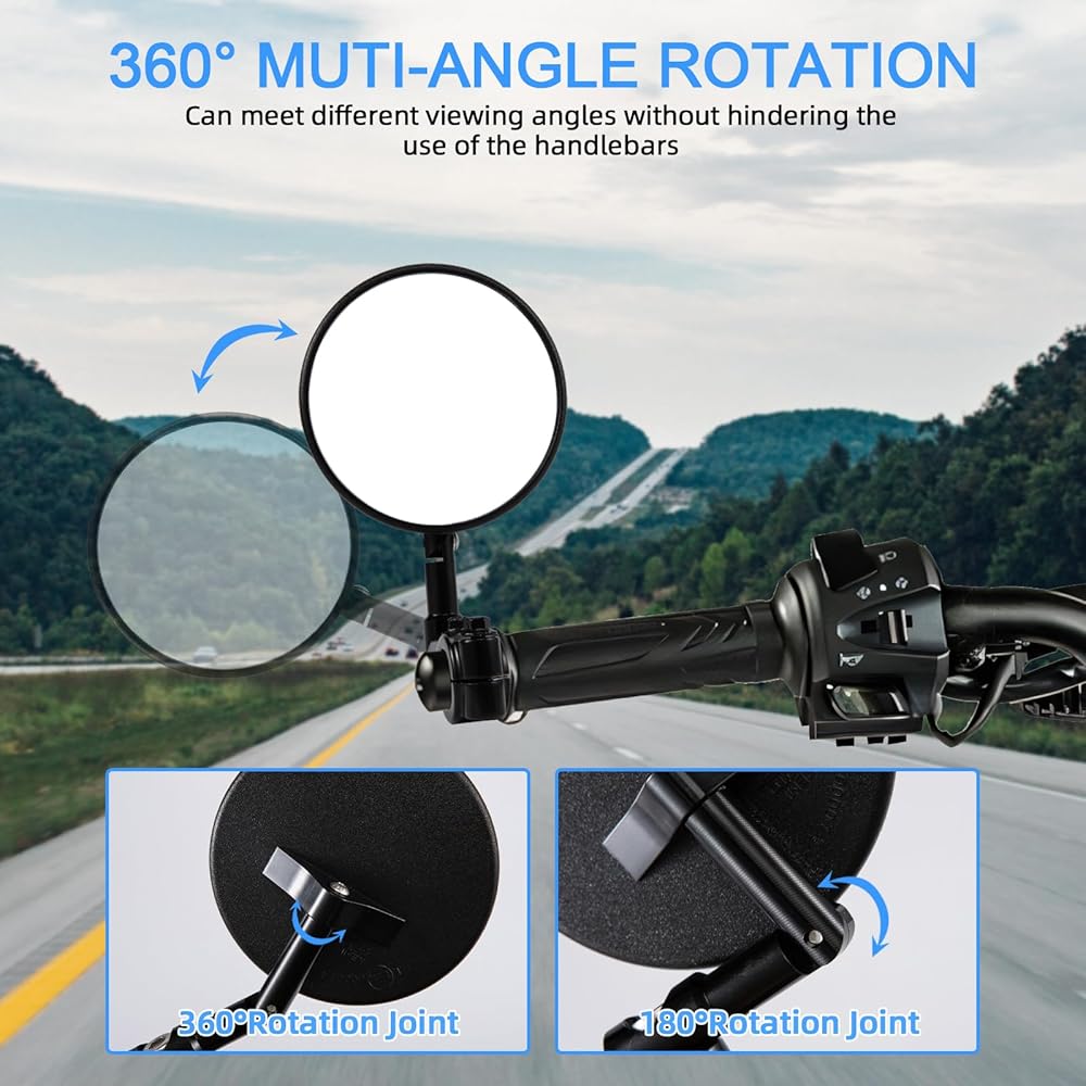 رؤية خالية من القلق: يمكن أن تدور مرآة الرؤية الخلفية الدائرية للدراجة النارية 360 درجة، ويمكن تعديل ذراع المرآة 146 درجة إلى اليسار واليمين. يمكنك فهم ظروف الطريق الخلفية والجانبية دون أن تدير رأسك أثناء الركوب