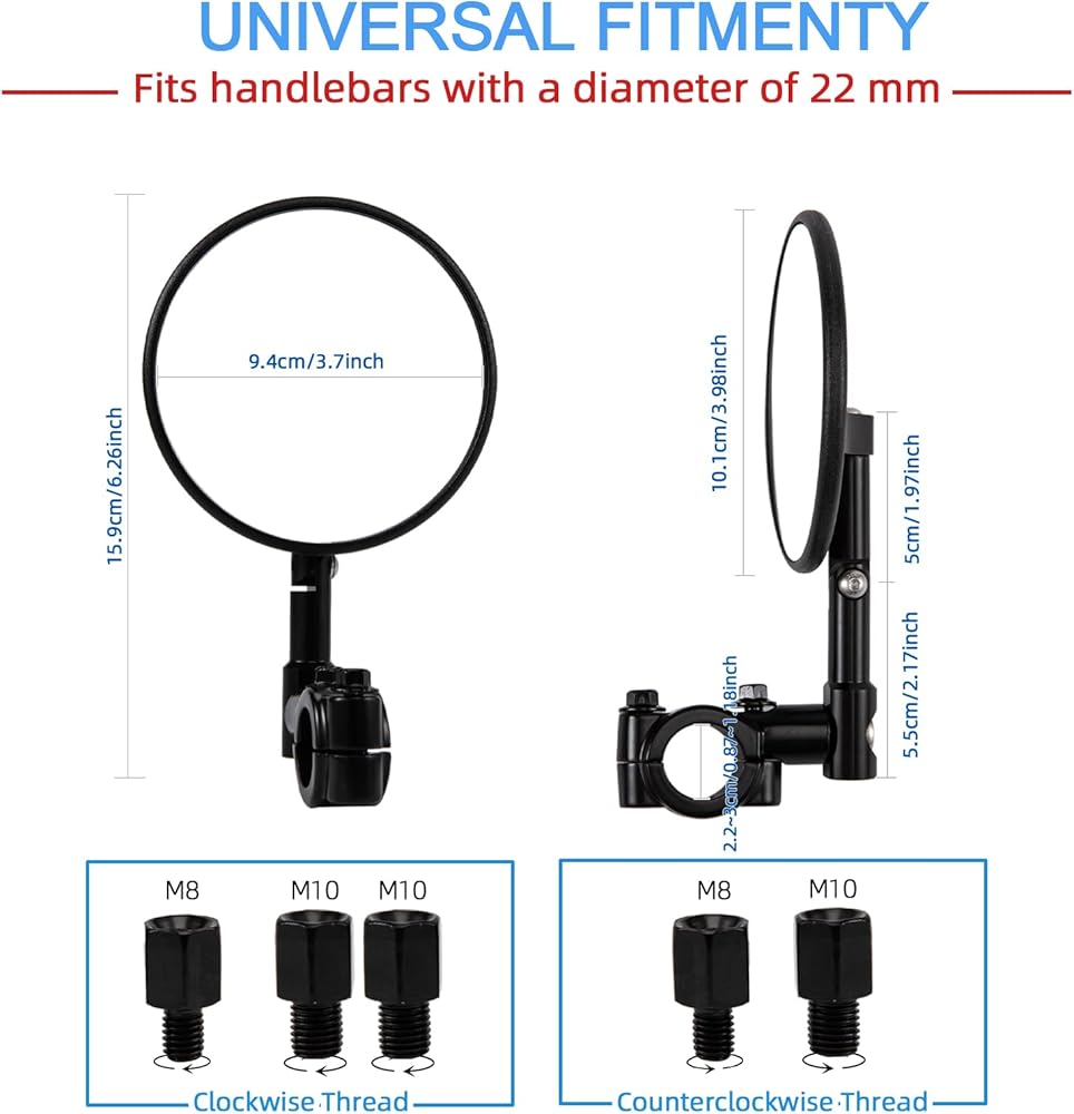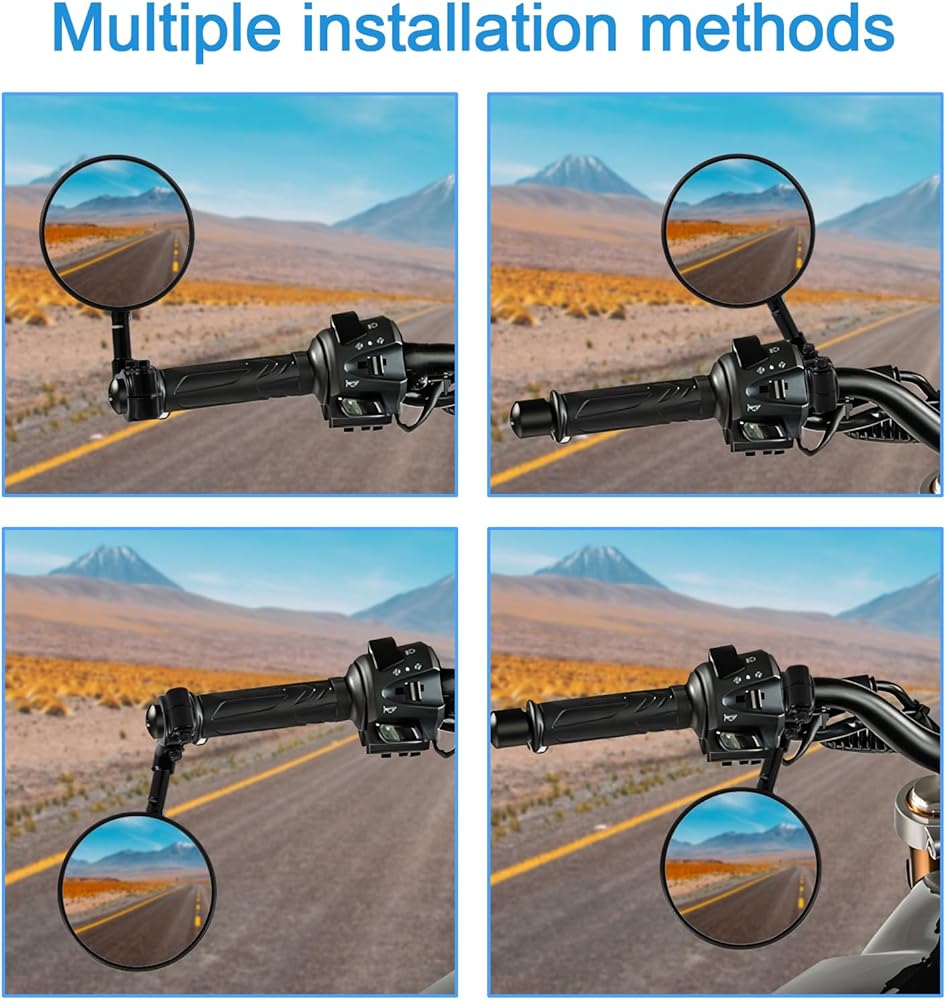 تركيب مريح: يمكن تركيب مرآة الرؤية الخلفية لمقود الدراجة النارية في منتصف أو نهاية المقود، دون الحاجة إلى تعديل الملحقات أو تمديد المقود، مما يقلل من خطر الخدوش على الطرق الضيقة