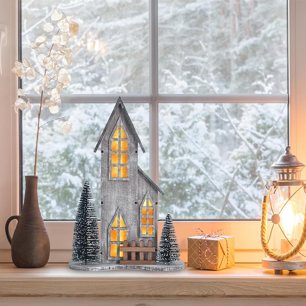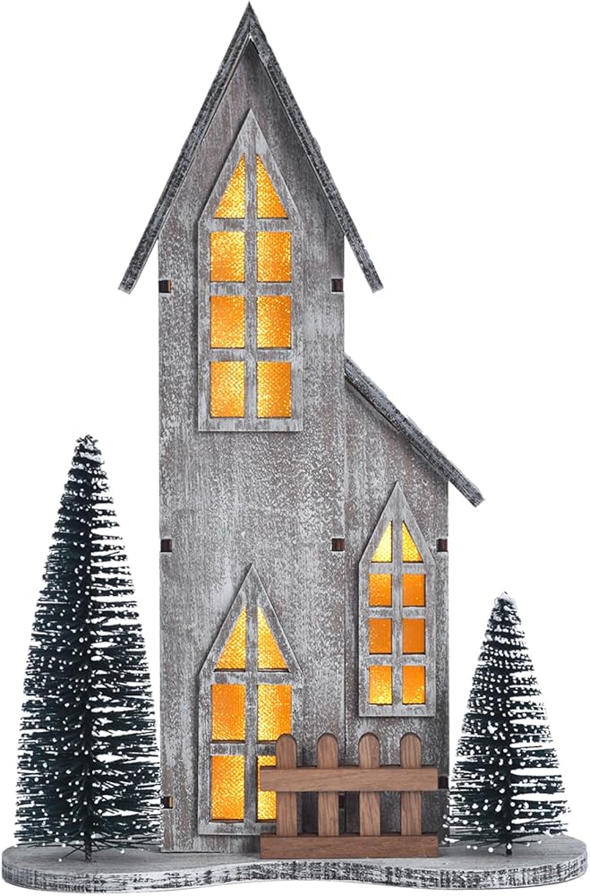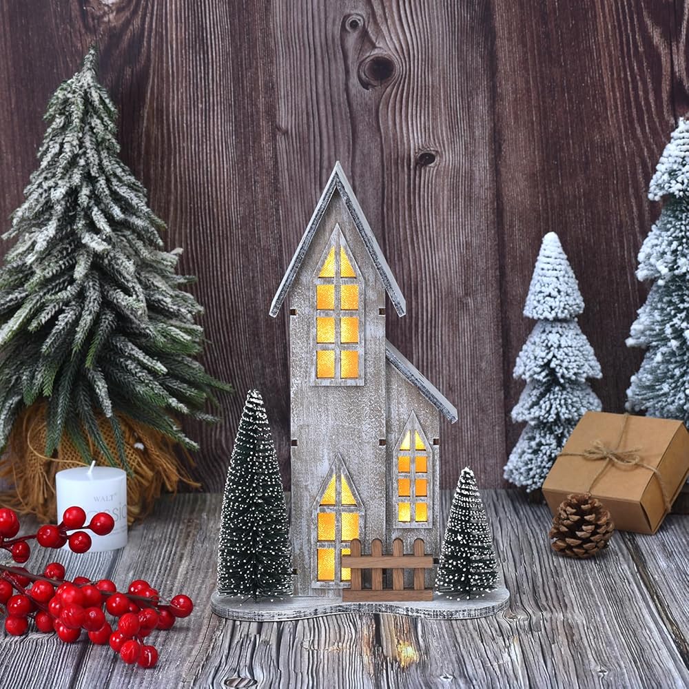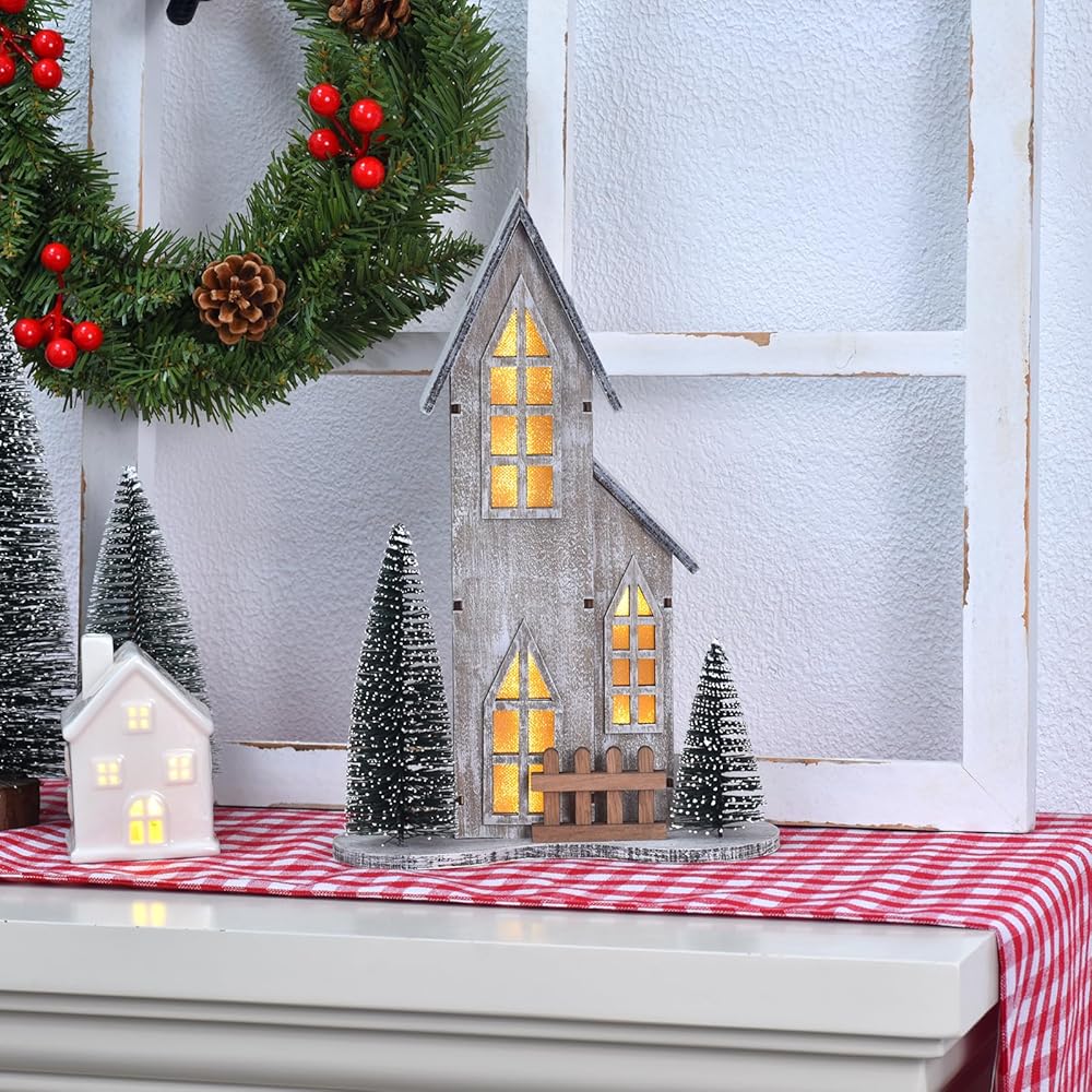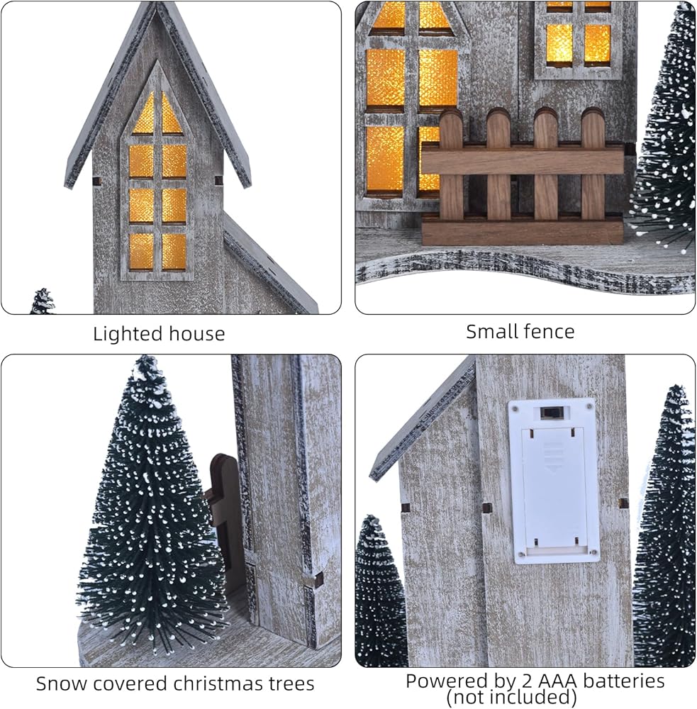 منزل قرية عيد الميلاد الخشبي مع LED، ديكور عيد الميلاد قطعة مركزية داخلية على الطاولة مع شجرة، ديكور منزل عيد الميلاد مضاء لغطاء رف المنزل، عرض قرية عطلة الشتاء (النمط أ)