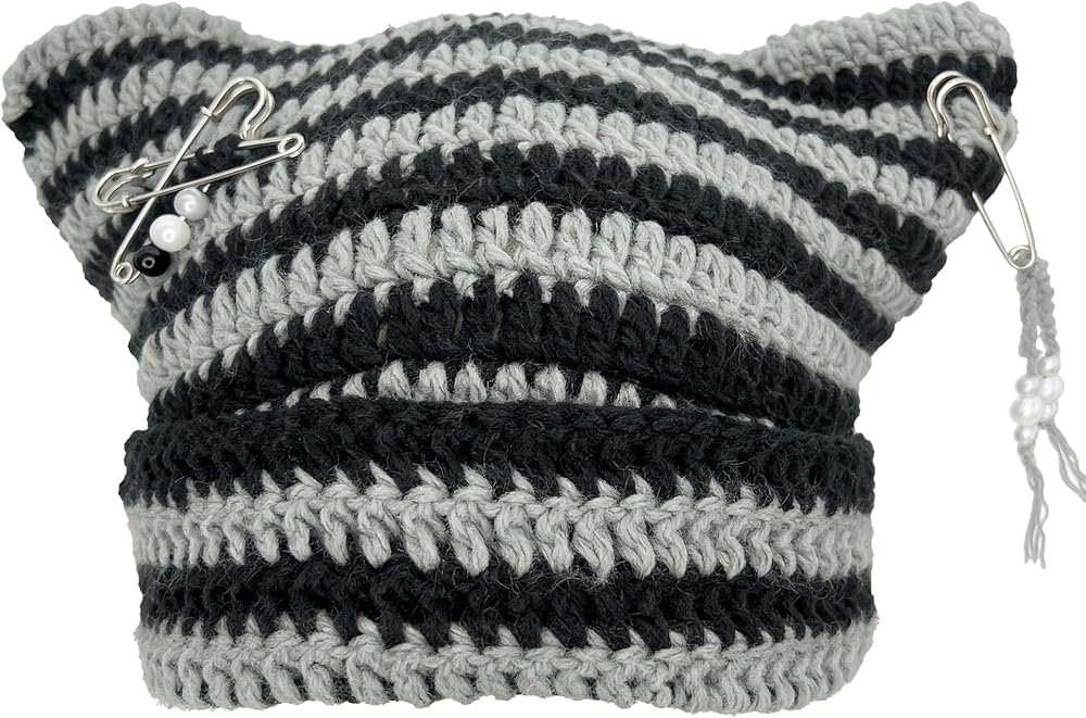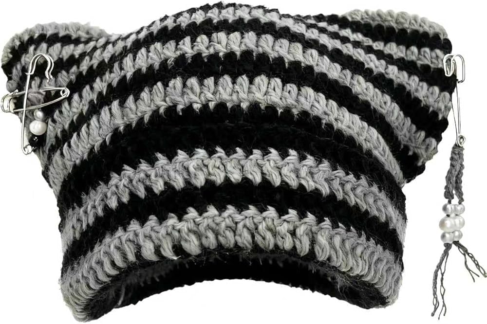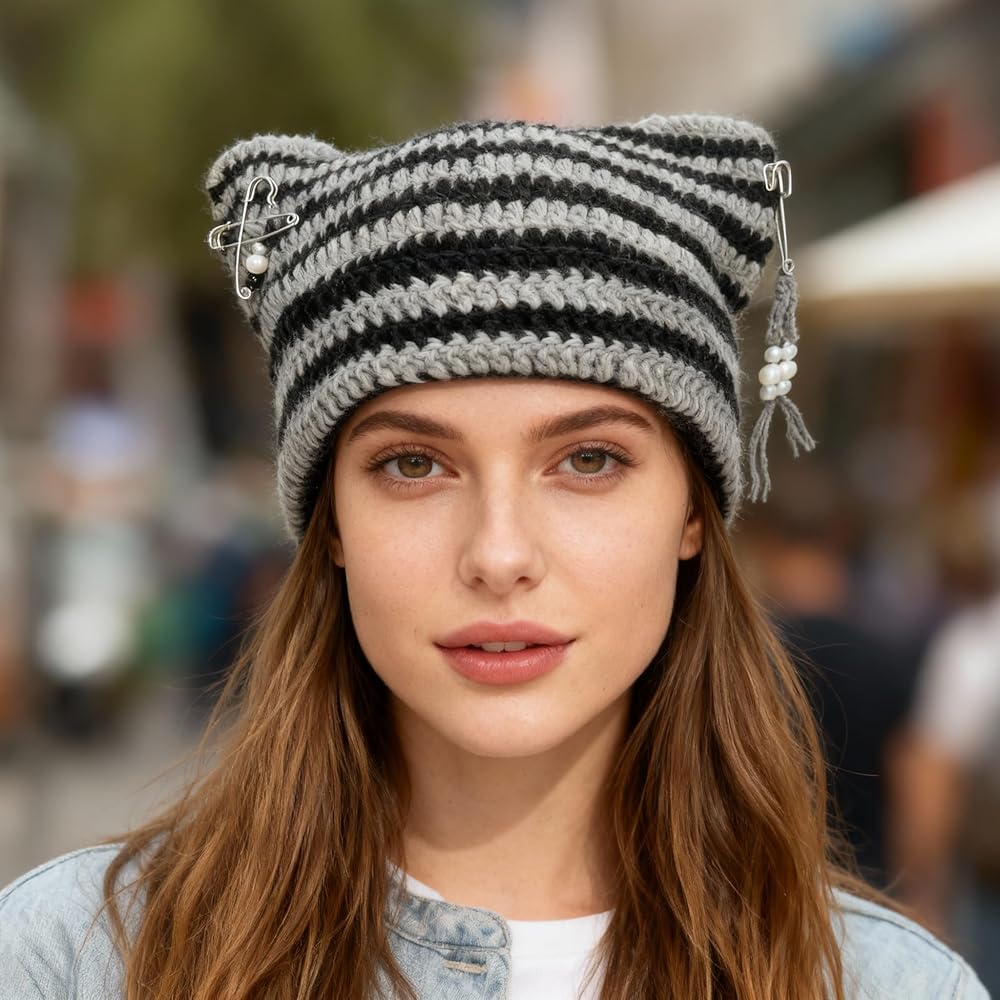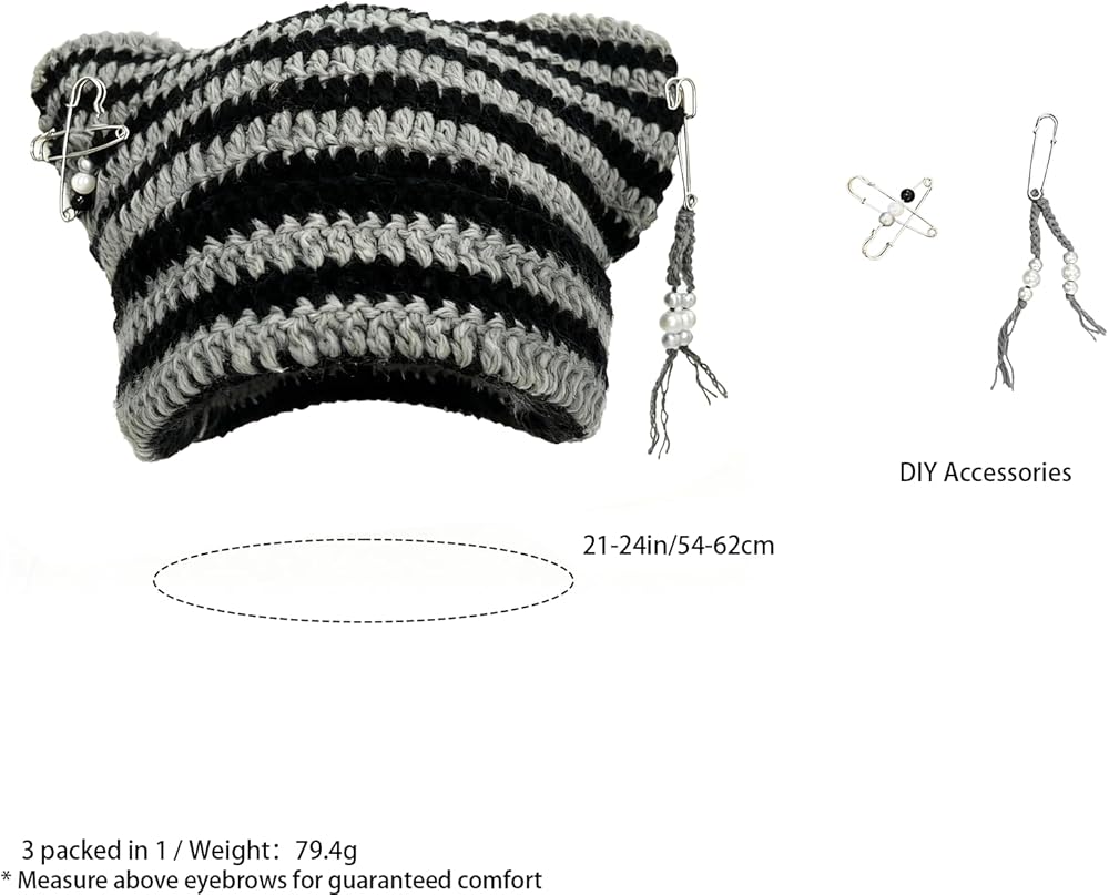 Step into the Y2K fashion revival with this charming crochet beanie hat featuring playful cat ears. Crafted from premium acrylic yarn in a striking green and white striped pattern, this hat offers both style and comfort for all-day wear. The versatile one-size design accommodates head sizes from 52cm to 60cm (20.5-23.6 inches), with flexible wearing options - pull it down for cozy ear coverage or position it higher for a trendy slouchy look. The included DIY accessories let you customize your look, making each styling unique and personal. The chunky crochet texture adds visual interest while maintaining softness against your skin. Perfect for adding a touch of whimsy to your winter wardrobe, this beanie combines nostalgic Y2K aesthetics with practical warmth. The alternating green and white stripes create an eye-catching pattern that's easy to coordinate with various outfits. Whether you're embracing cute style or channeling Y2K vibes, this versatile beanie adapts to your fashion mood with simple accessory changes.