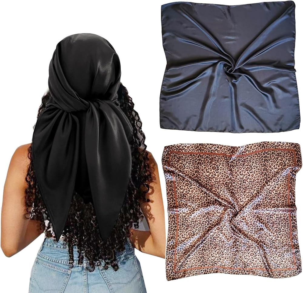 【مجموعة من قطعتين من وشاح الشعر الساتان】وشاح من الساتان مقاس مثالي: 35 × 35 بوصة / 90 × 90 سم. مجموعة من قطعتين وشاح حريري مربع كبير بأنماط جميلة مختلفة هي مجموعة مثالية للملابس اليومية.