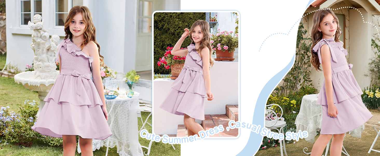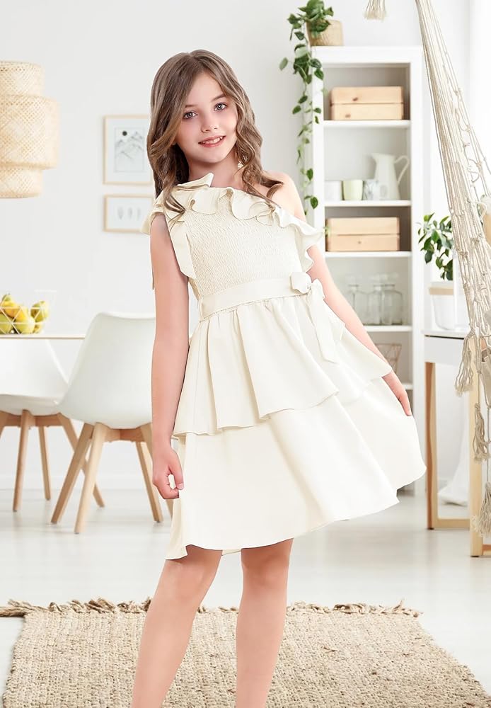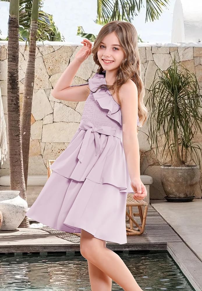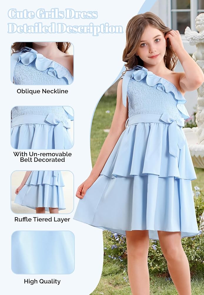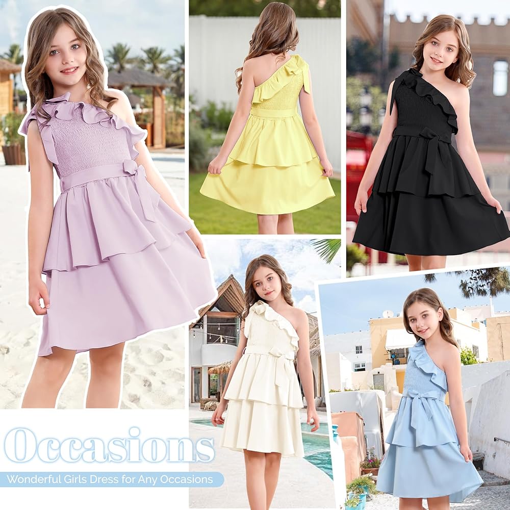 【مناسب تمامًا للفتيات】 مصمم للأعمار من 5 إلى 14 عامًا، هذا الفستان المكشكش بكتف واحد يتكيف مع الفتيات في مرحلة النمو. يضمن الخصر المطاطي والحزام القابل للفصل ملاءمة مرنة ومريحة. سواء كنت تتسوقين لشراء فساتين للأطفال أو المراهقين أو فساتين المراهقات أو فساتين الفتيات المزهرات لحفلات الزفاف، فإن هذا الفستان يوفر الأناقة والراحة.