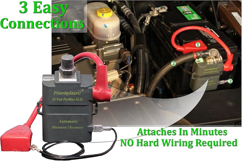 The 12V ProMax H.D. from PriorityStart! is the only automatic computerized on/off protection system for your battery, alternator, and electrical system on the market today. It recognizes when your battery's voltage drops to 11.7 volts, and then disconnects so that the battery's voltage can recover. The 12V ProMax H.D. offers heavier load capacity (up to 1,600 starting amps/400 continuous amps) for the effectiveness you want.