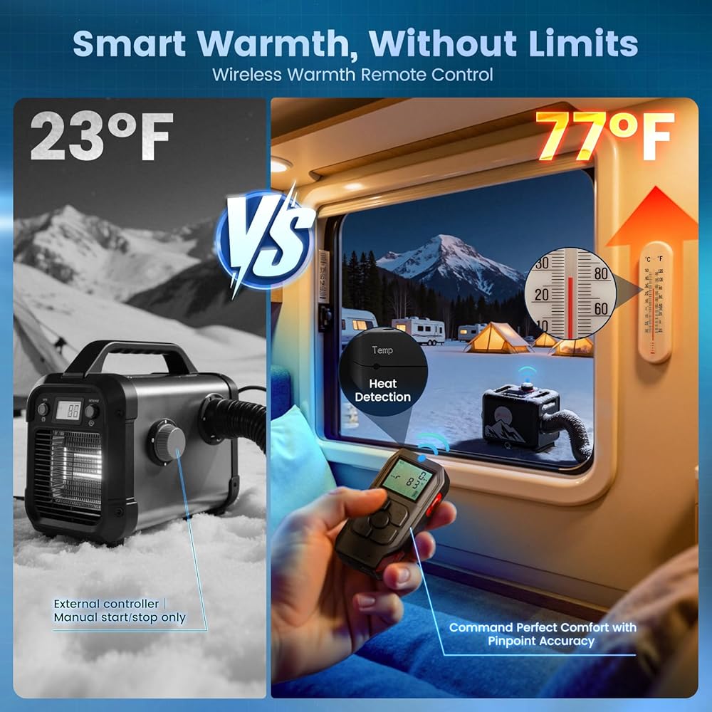 【تحكم حقيقي في درجة الحرارة عن بعد】يعمل جهاز التحكم عن بعد اللاسلكي كمنظم حرارة داخلي، حيث يستشعر درجة حرارة الغرفة الفعلية للتحكم الدقيق. ضع المدفأة خارج خيمتك أو شاحنتك أو مقصورتك وقم ببساطة بتشغيل قناة الحرارة بالداخل. يتيح ذلك إعدادًا أكثر أمانًا وهدوءًا وأكثر كفاءة في استخدام المساحة، حيث لم تعد الوحدة الرئيسية بحاجة إلى شغل منطقة معيشتك. استمتع براحة تلقائية تمامًا بناءً على درجة الحرارة في مكانك، وليس على موقع المدفأة.