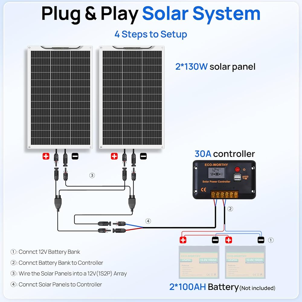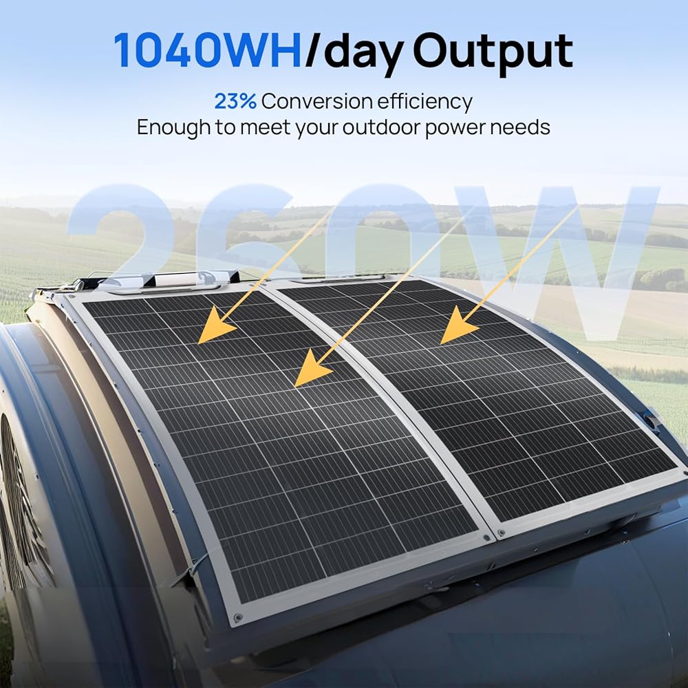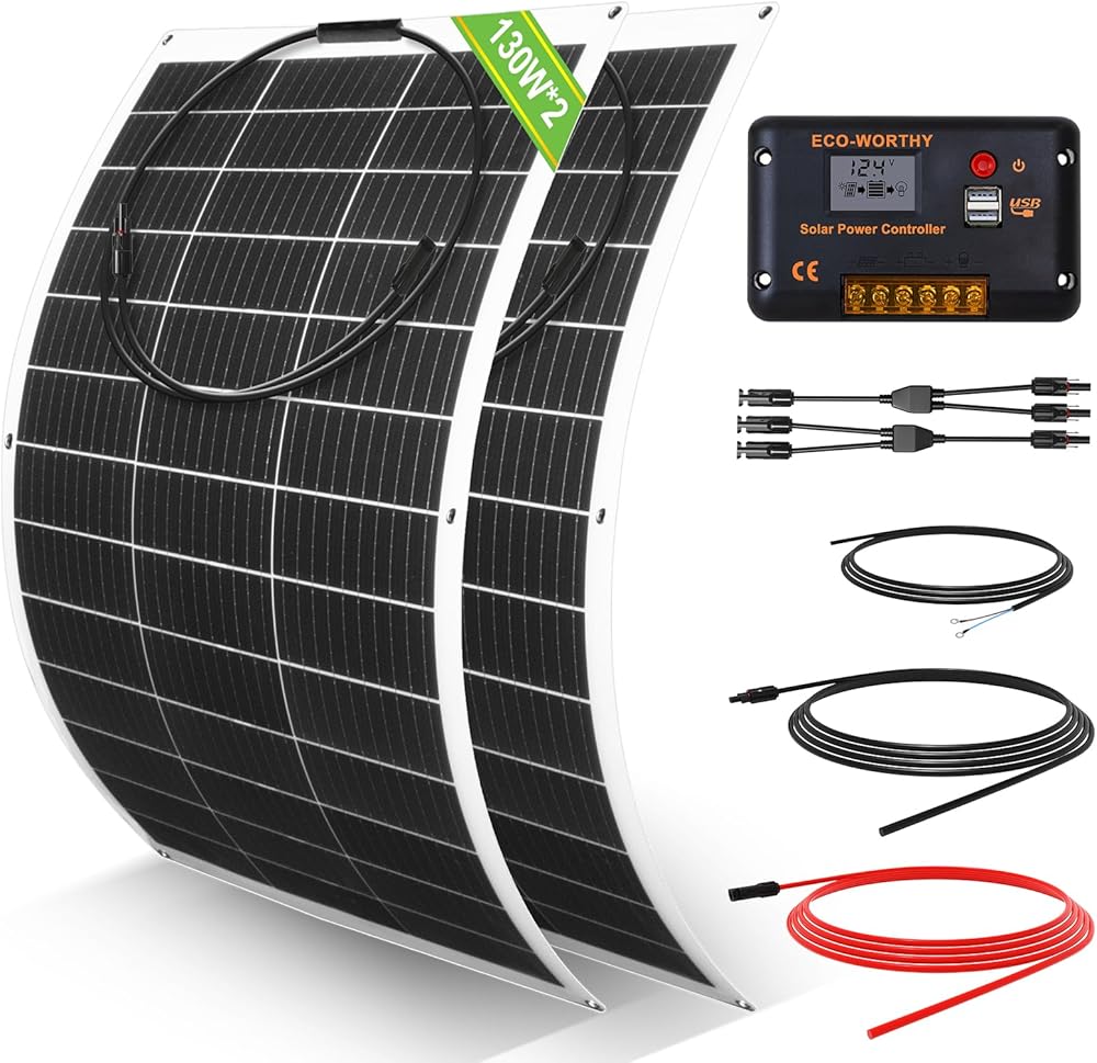 مجموعة ألواح شمسية مرنة بقدرة 260 وات 12 فولت صديقة للبيئة للمركبات الترفيهية المنزلية والقوارب والأسطح غير المستوية: قطعتان من الألواح الشمسية الأحادية بقدرة 130 وات + وحدة تحكم في الشاحن 30 أمبير 12 فولت + كابل شمسي + كابل صينية + فرع على شكل حرف Y