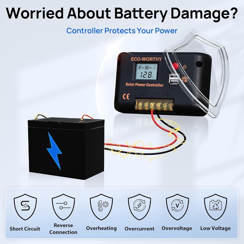[حماية شاملة]: تتميز وحدة التحكم بالطاقة الشمسية ECO-WORTHY بحماية من الدائرة القصيرة، وحماية الدائرة المفتوحة، وحماية عكسية، وحماية من الحمل الزائد. إدارة شحن PWM ثلاثية المراحل بالكامل، وتحسين كفاءة النظام وإطالة عمر البطارية
