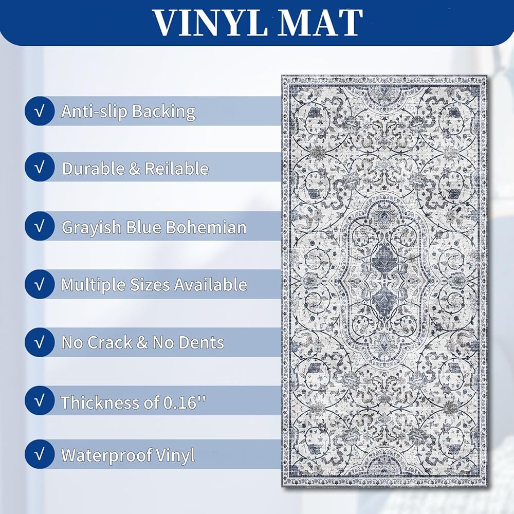 سجادة الفينيل الفاخرة: مصنوعة من مواد الفينيل المقاومة للماء والمتينة، تصمد هذه السجادة الأرضية أمام البلى والتمزق اليومي، مما يوفر حماية دائمة لأرضياتك. يرجى ملاحظة: يستخدم للأرضيات الصلبة فقط، وليس لأي سجاد!
