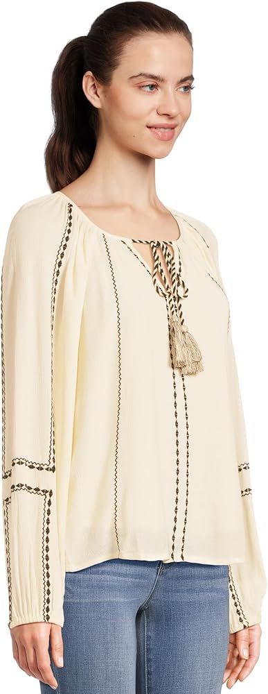 • Look effortless and chic with the Liverpool Los Angeles Long Sleeve Woven Raglan Blouse With Embroidery. This stylish top features embroidered pattern with a flattering fit that pairs well with your favorite jeans.