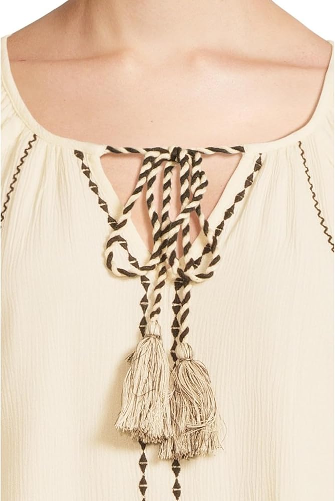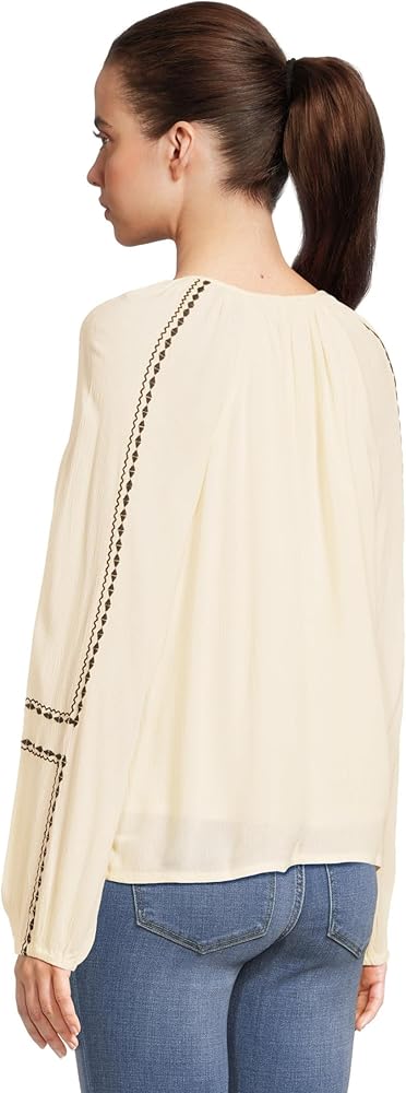 Look effortless and chic with the Liverpool Los Angeles Long Sleeve Woven Raglan Blouse With Embroidery. This stylish top features embroidered pattern with a flattering fit that pairs well with your favorite jeans. V-neckline and long puffy sleeves. Pull-on style. 97% viscose, 3% elastane. Hand wash only.