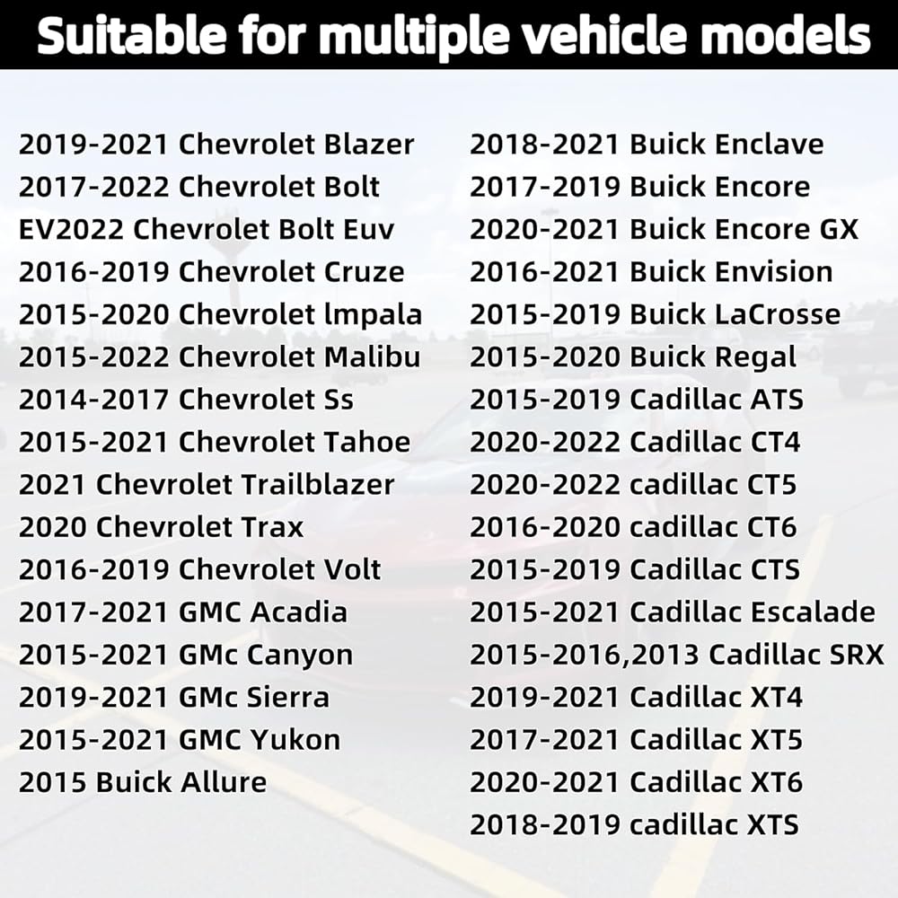 يناسب: Buick Enclave، Encore GX، Envision، LaCrosse، Regal Sportback، Regal TourX Cadillac: ATS، CT4، CT5، CT6، CTS، Escalade، Escalade ESV، LYRIQ، XT4، XT5، XT6، XTS شيفروليه: Blazer، Bolt EUV، Bolt EV، Camaro، Caprice، Colorado، Corvette، Cruze، إكوينوكس، إمبالا، ماليبو، سيلفرادو 1500، سيلفرادو 1500 LD، سيلفرادو 1500 LTD، سيلفرادو 2500 HD، سيلفرادو 3500 HD، SS، سوبربان، تاهو، تريل بليزر، ترافيرس، فولت جي إم سي: أكاديا، كانيون، هامر EV بيك اب، سييرا 1500، سييرا 2500 HD، سييرا 3500 HD، تيرين، يوكون، يوكون XL
