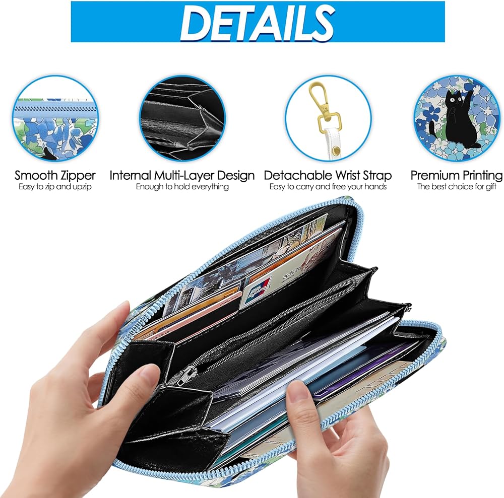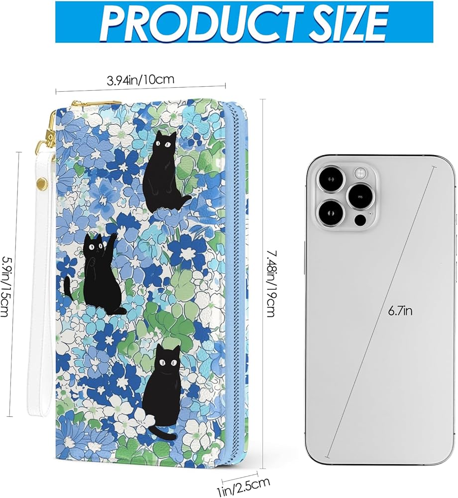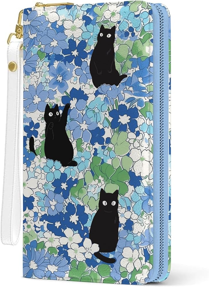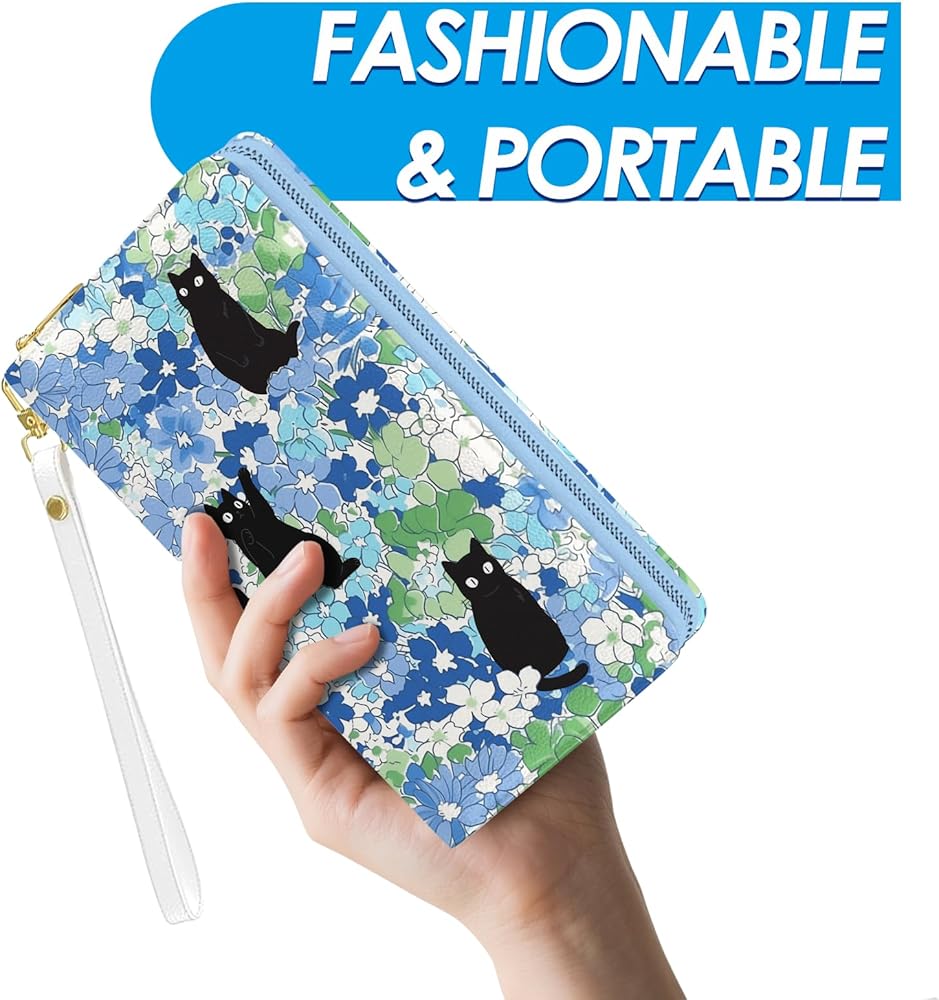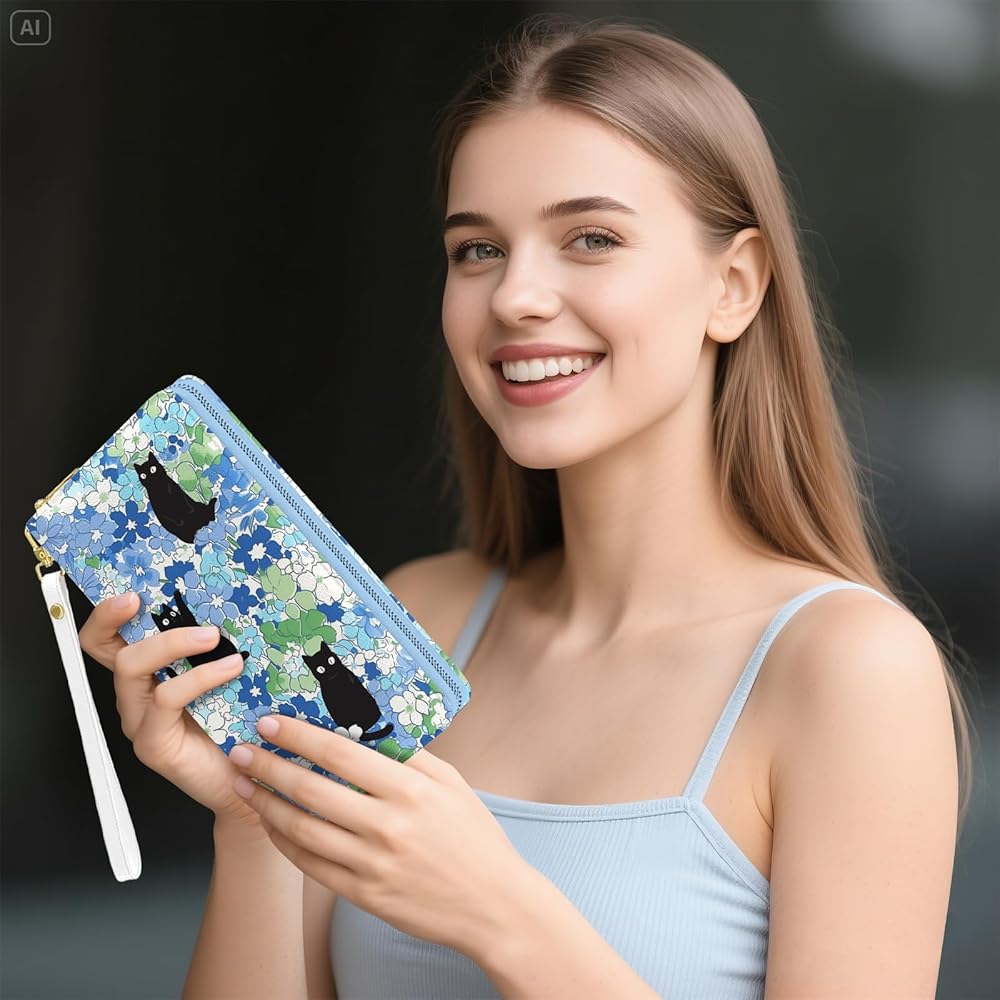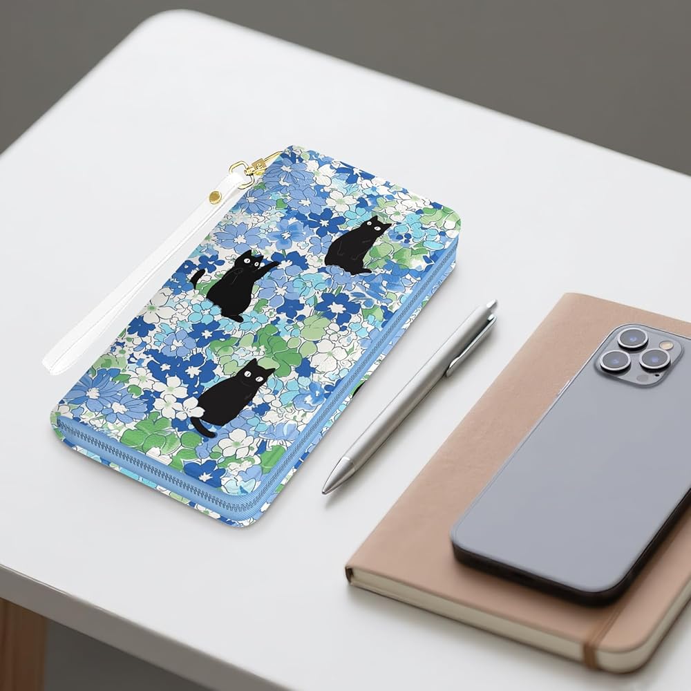 محفظة نسائية، محفظة معصم للقطط السوداء للنساء، محفظة حامل بطاقات الائتمان على شكل زهور زرقاء مع سحاب، هدايا عيد الميلاد والتخرج للأمهات، ومحفظة يومية لمكتب السفر