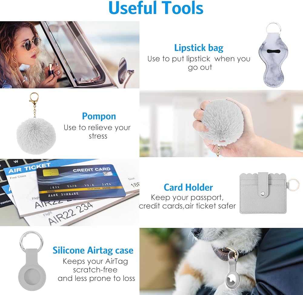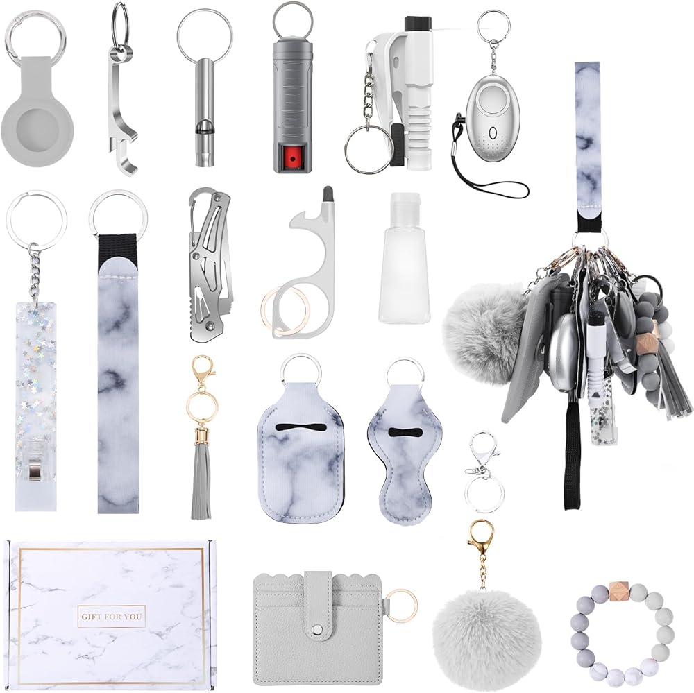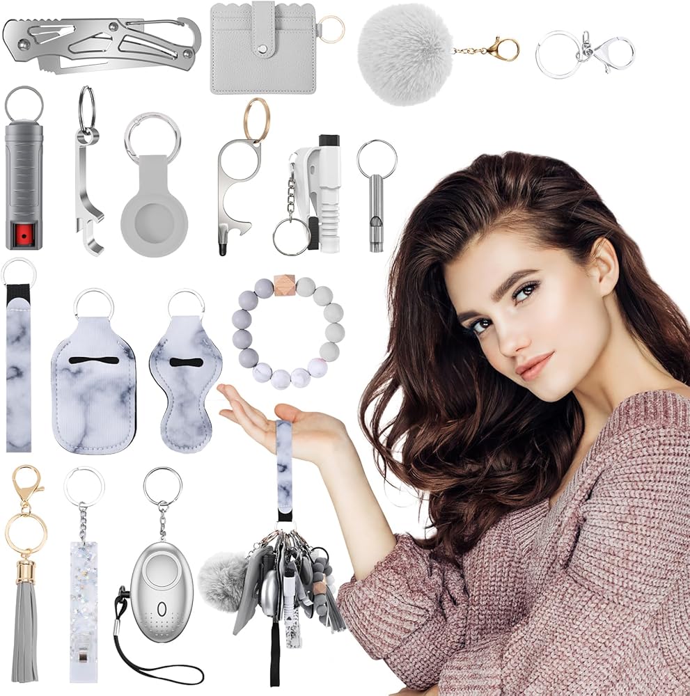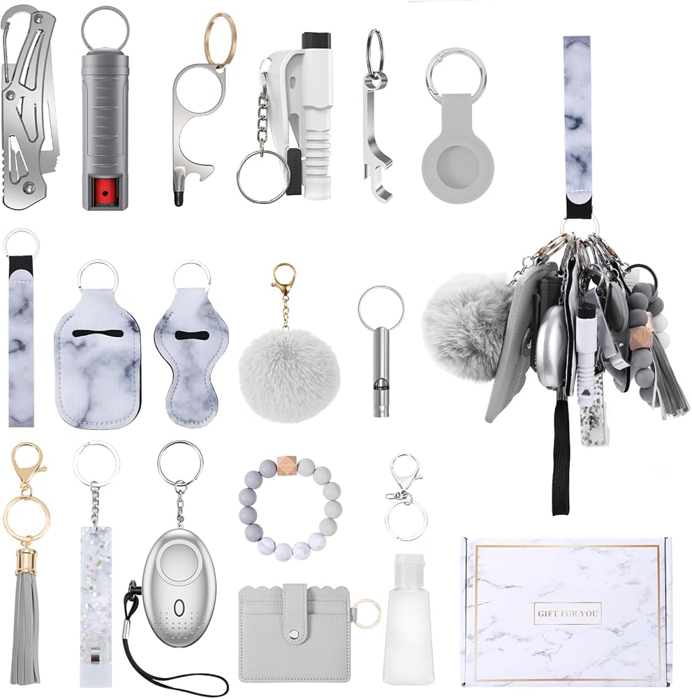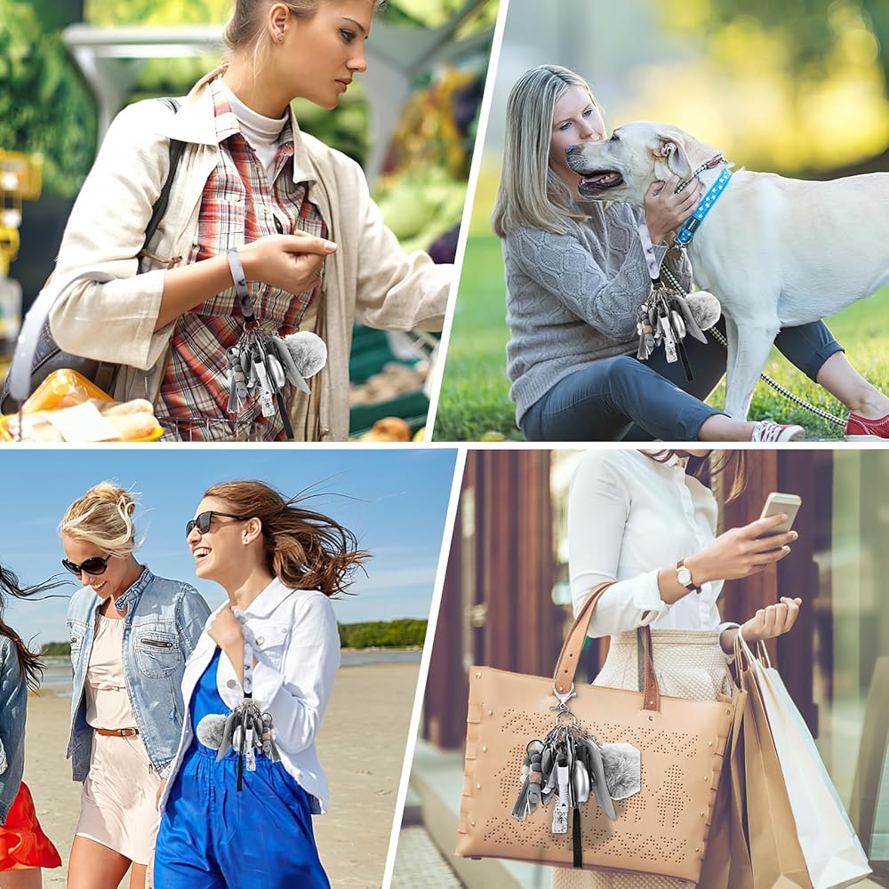 مجموعة سلاسل مفاتيح أمان مطورة للنساء، منبه شخصي، حزام معصم، حامل بطاقات، بوم بوم، مجموعة سلاسل مفاتيح للنساء والفتيات (17 قطعة، رمادي)