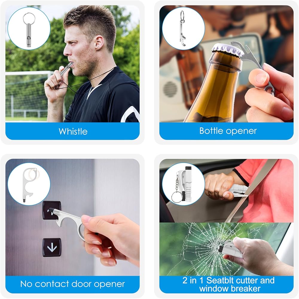 • 【 أحدث مجموعة سلسلة مفاتيح أمان】 تتضمن مجموعة سلسلة مفاتيح الأمان هذه أدوات الطوارئ: الصفارات، وأجهزة الإنذار الشخصية، وأكثر من ذلك، بالإضافة إلى حافظات البطاقات العملية، وسلاسل المفاتيح، وفتحات الأبواب، وغيرها من العناصر الأساسية. يمكنك المزج والمطابقة حسب رغبتك