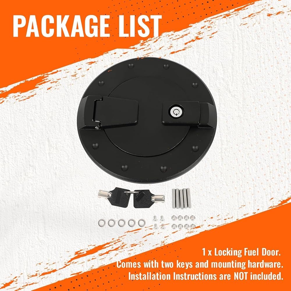 PACKAGE LIST - 1 x Locking Fuel Door (Silvery). Comes with two keys and mounting hardware. Installation Instruction is included.