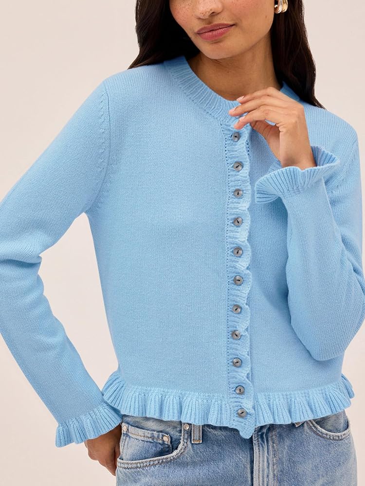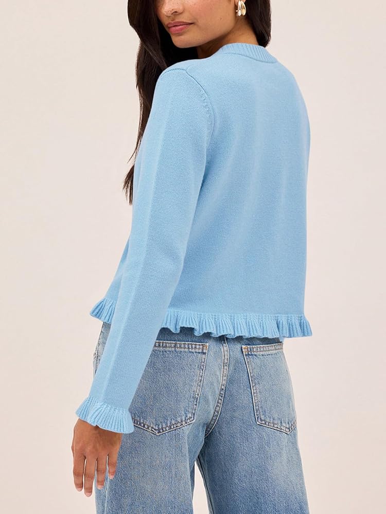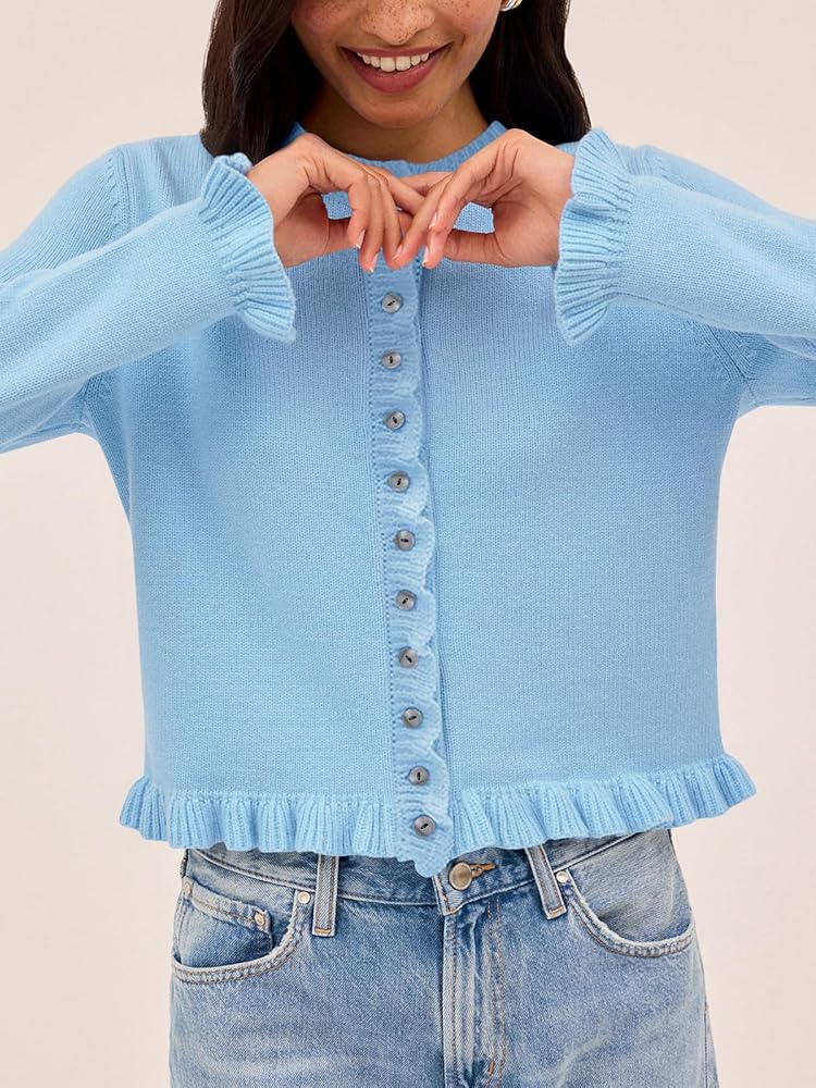 • المميزات: تصميم هذه السترات اللطيفة برقبة دائرية، وأكمام طويلة، وسترة صوفية مفتوحة بأزرار سفلية، وفضفاضة إلى حد ما، وطول قصير يصل إلى جزء الخصر، وتفاصيل مكشكشة تضيف بعض الشعور البناتي، والأزرار الصغيرة تجعلها تبدو أكثر روعة.