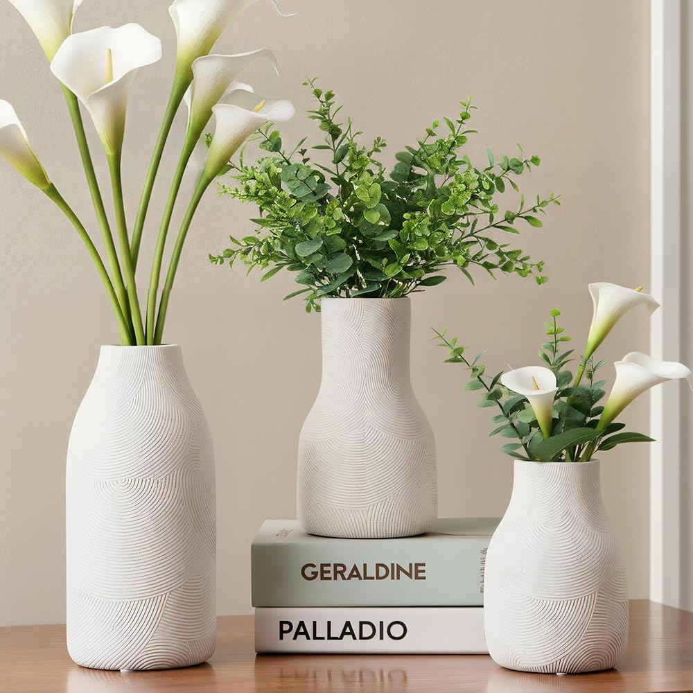 مزهرية سيراميك حديثة - تتميز هذه المزهرية الخزفية المزخرفة بنمط دوامي ذو طبقات منحوت يدويًا يضيف نسيجًا ديناميكيًا واهتمامًا بصريًا إلى أي غرفة. مزيج مثالي من البساطة والحرفية الحرفية، فهو يعمل كمزهرية وقطعة منحوتة.