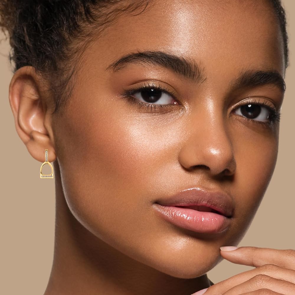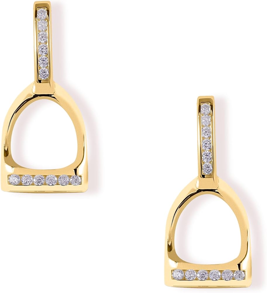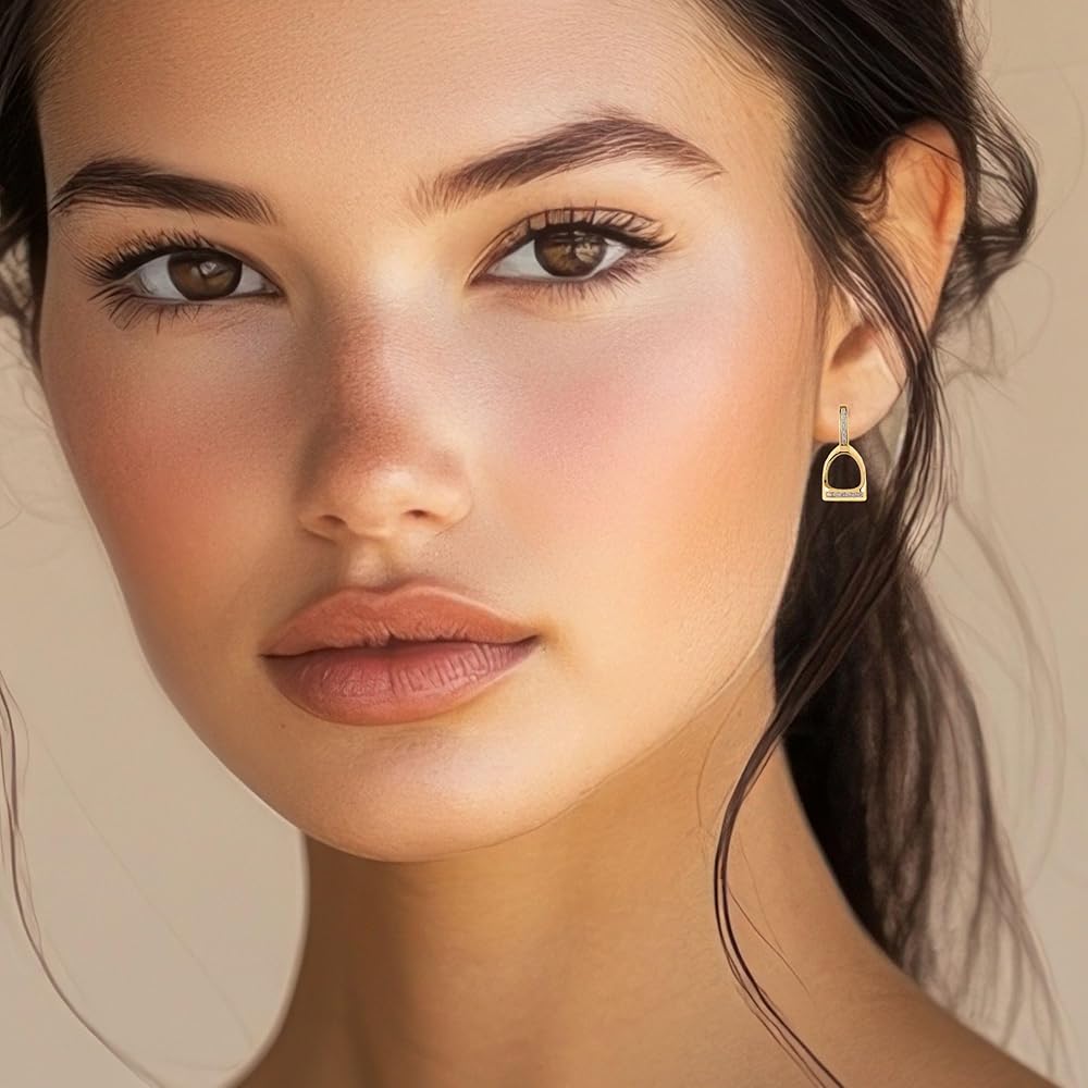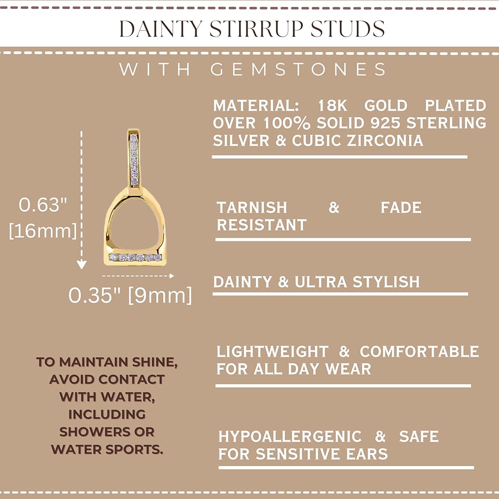 Add a touch of equestrian elegance to your everyday look with these Dainty Stirrup Stud Earrings, crafted in solid 925 sterling silver and luxuriously plated in 18K gold. Featuring a sleek, minimalist stirrup shape adorned with brilliant-cut cubic zirconia gemstones, these earrings combine timeless symbolism with a modern, polished finish. Measuring approximately 0.63 inches (16mm) tall by 0.35 inches (9mm) wide, the compact design offers just the right amount of sparkle while maintaining a lightweight feel that's perfect for all-day wear. The push-back closure ensures a secure and comfortable fit, making them an effortless accessory from morning to night. Inspired by classic riding gear, the stirrup motif evokes strength, elegance, and heritage style—making these earrings a meaningful piece for equestrian lovers and fans of refined minimalism alike. Whether worn solo or paired with other equestrian jewelry, they bring a subtle, sophisticated edge to any outfit. These studs are nickel-free, hypoallergenic, and fade- and tarnish-resistant, making them a safe and low-maintenance option for sensitive ears. The high-polish 18K gold finish catches the light beautifully while maintaining its brilliance with proper care. Each pair comes thoughtfully packaged in a soft cotton jewelry pouch, ready to gift for birthdays, holidays, anniversaries, or personal milestones. With their iconic shape, subtle shimmer, and everyday versatility, these dainty stirrup studs are a stylish staple made to endure—both in look and meaning.