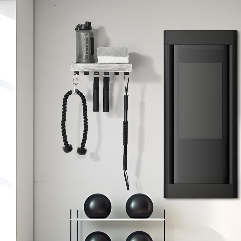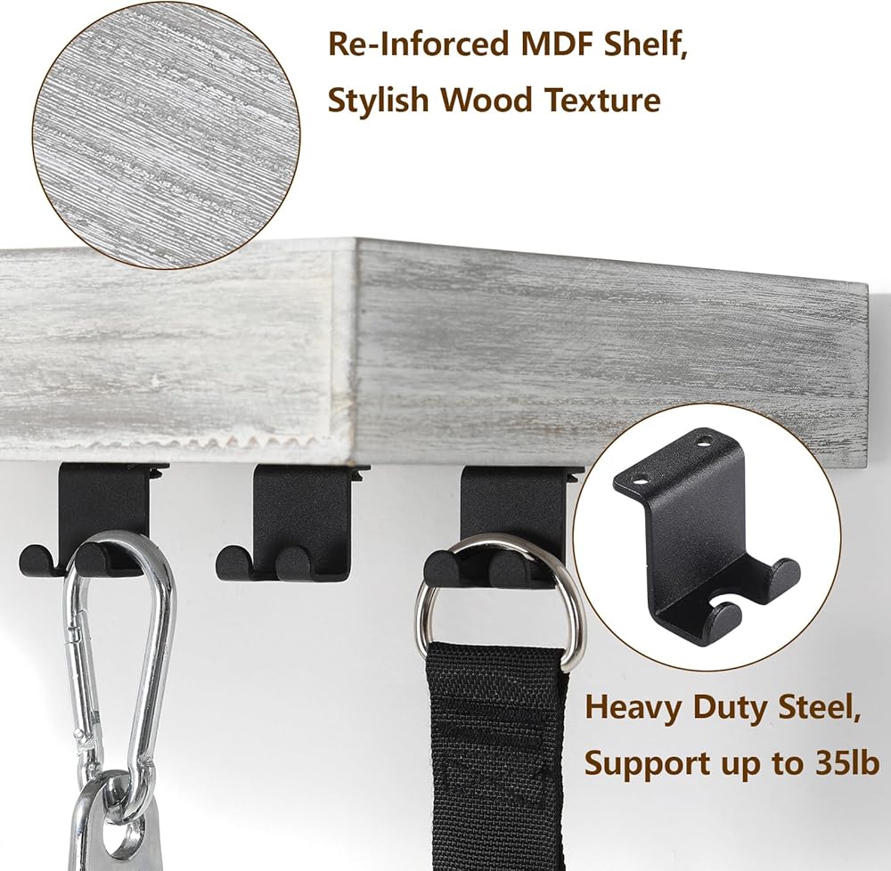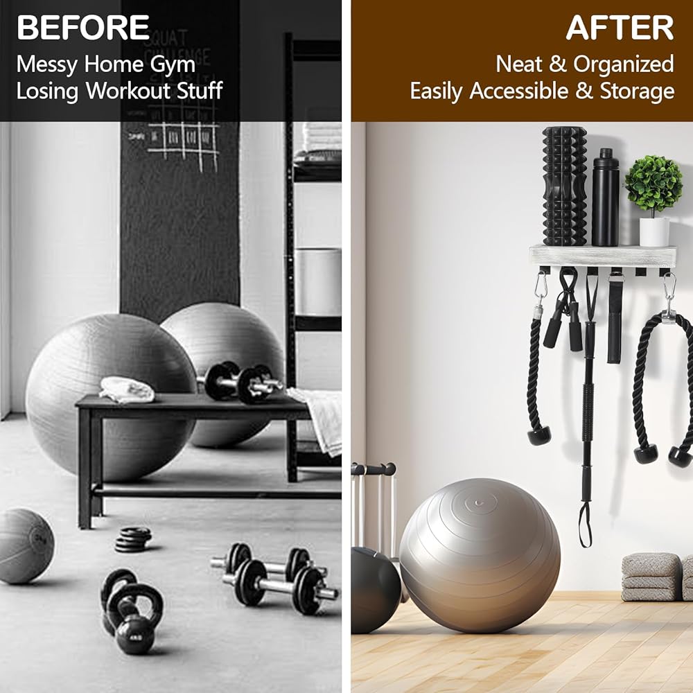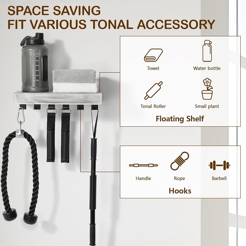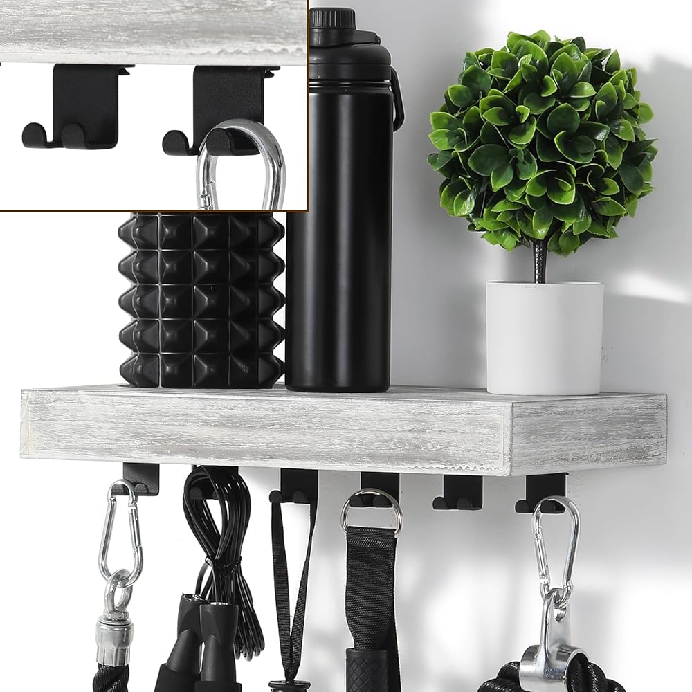 منظم متعدد الوظائف: يتميز رف التخزين المتناغم هذا بمساحة تخزين متعددة الاستخدامات مع خطافات سفلية لتعليق المقابض والحبال والأثقال، في حين أن الرف العائم مثالي لحمل المناشف وزجاجات المياه والبكرات المتناغمة أو حتى النباتات الصغيرة في كل من الصالات الرياضية المنزلية والمحترفة.