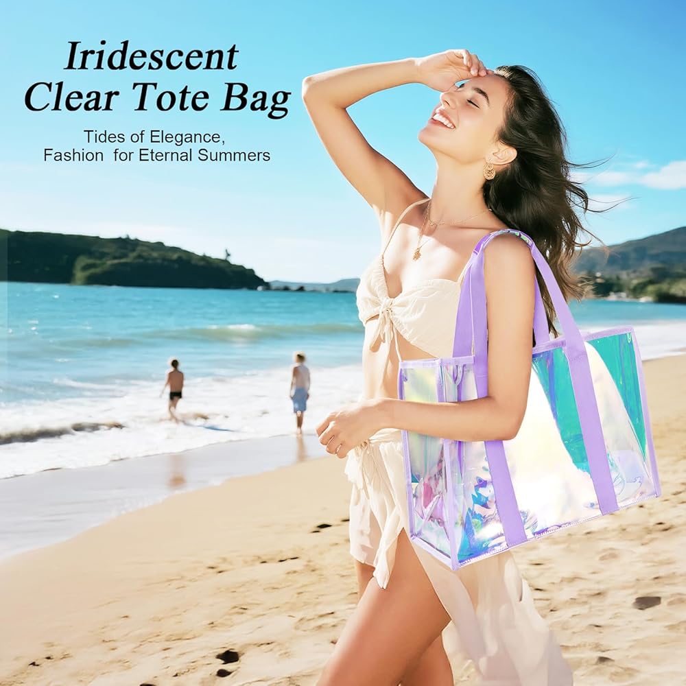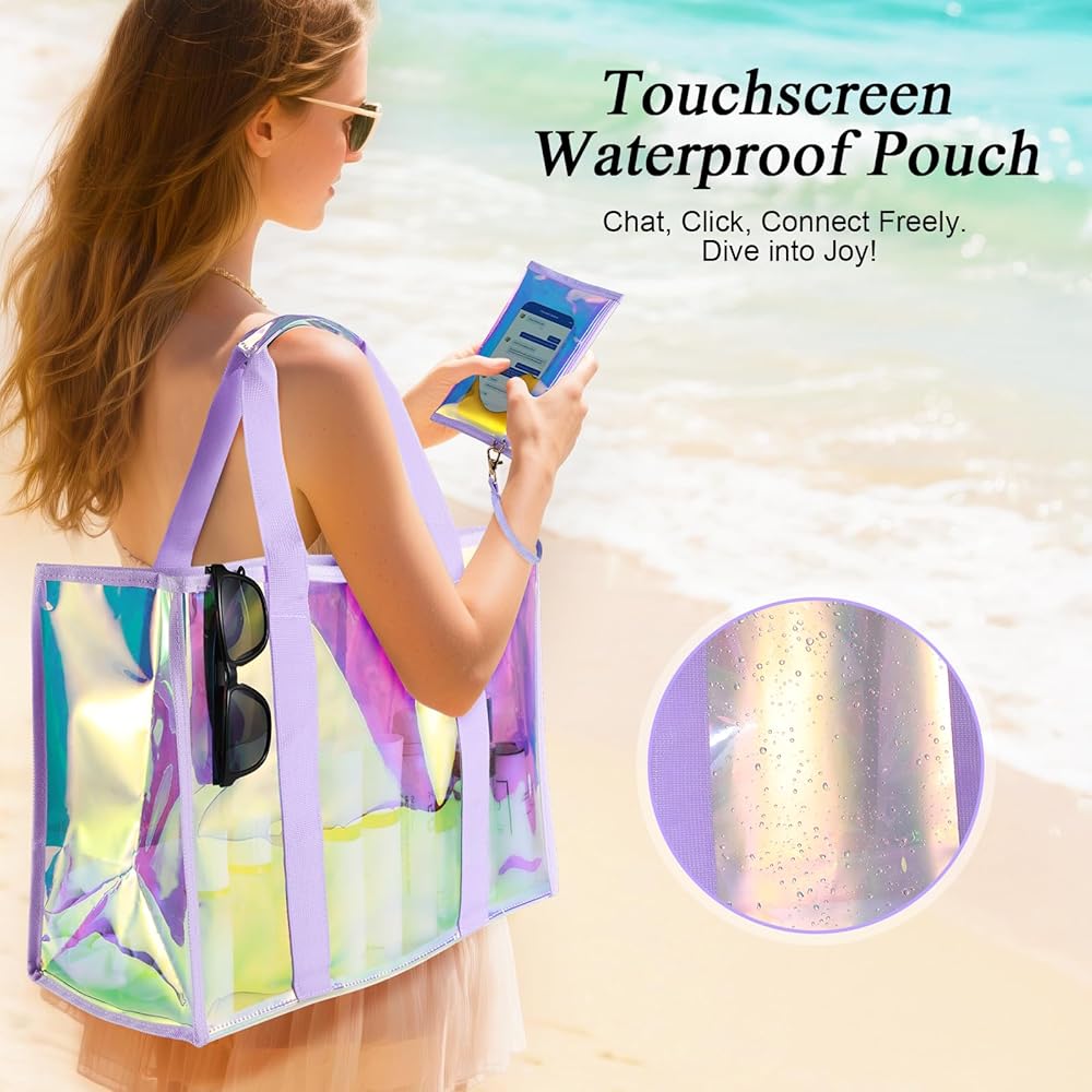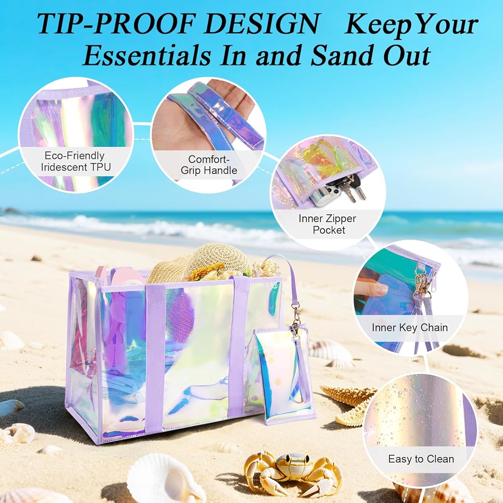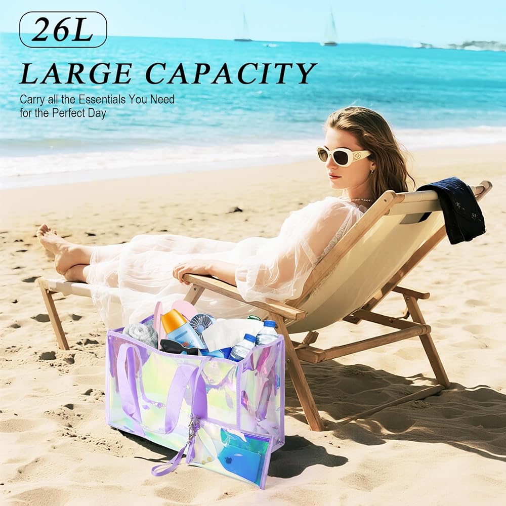 Premium Beach Tote: 26L transparent hauler with TPU material (3x scratch-proof) for beach/pool/cruise trips. Features sandproof & waterproof seals, crease-free folds (80% smaller packed), and holographic sheen—where fashion meets function. Smart Adventure Tote: 26L XL beach bag holds 3 towels + 6 drinks & essentials. Tip-proof base + widened straps stay upright on sand. Folds palm-sized—stashes in purses/car doors, beating bulky coolers. Multi-Scene Versatility: From beach trips to pool parties, cruise vacations to gym workouts—sand-proof base + quick-drain vents + fold-flat design adapts effortlessly. Real-Life Ready: Details That Deliver -- Waterproof Phone Pouch Touchscreen works through waterproof shield. All sizes fit. -- No-Loss Interior Zippered waterproof pocket + clip-on key leash. -- Earth Armor TPU 3x scratch-proof. 90% returns to earth. Unbreakable Joy Guarantee: 365-Day Adventure Shield: Hassle-free replacement if scratches or damage occurs