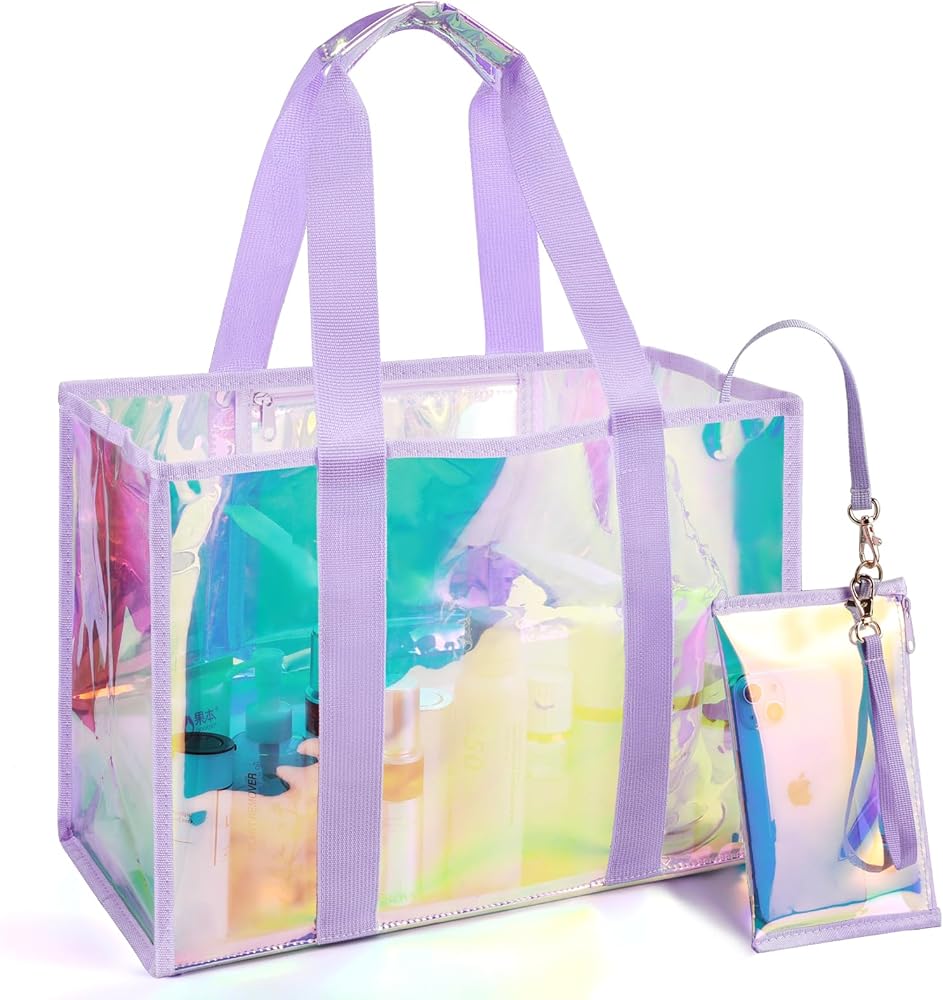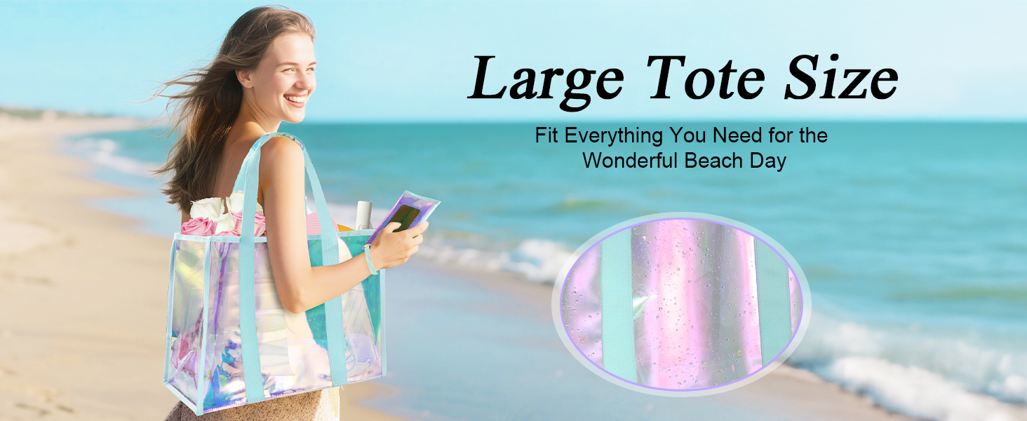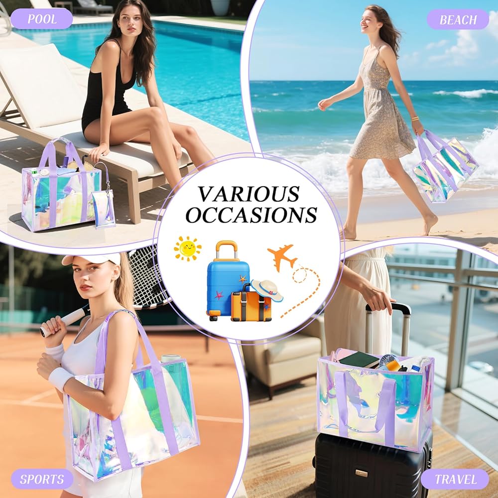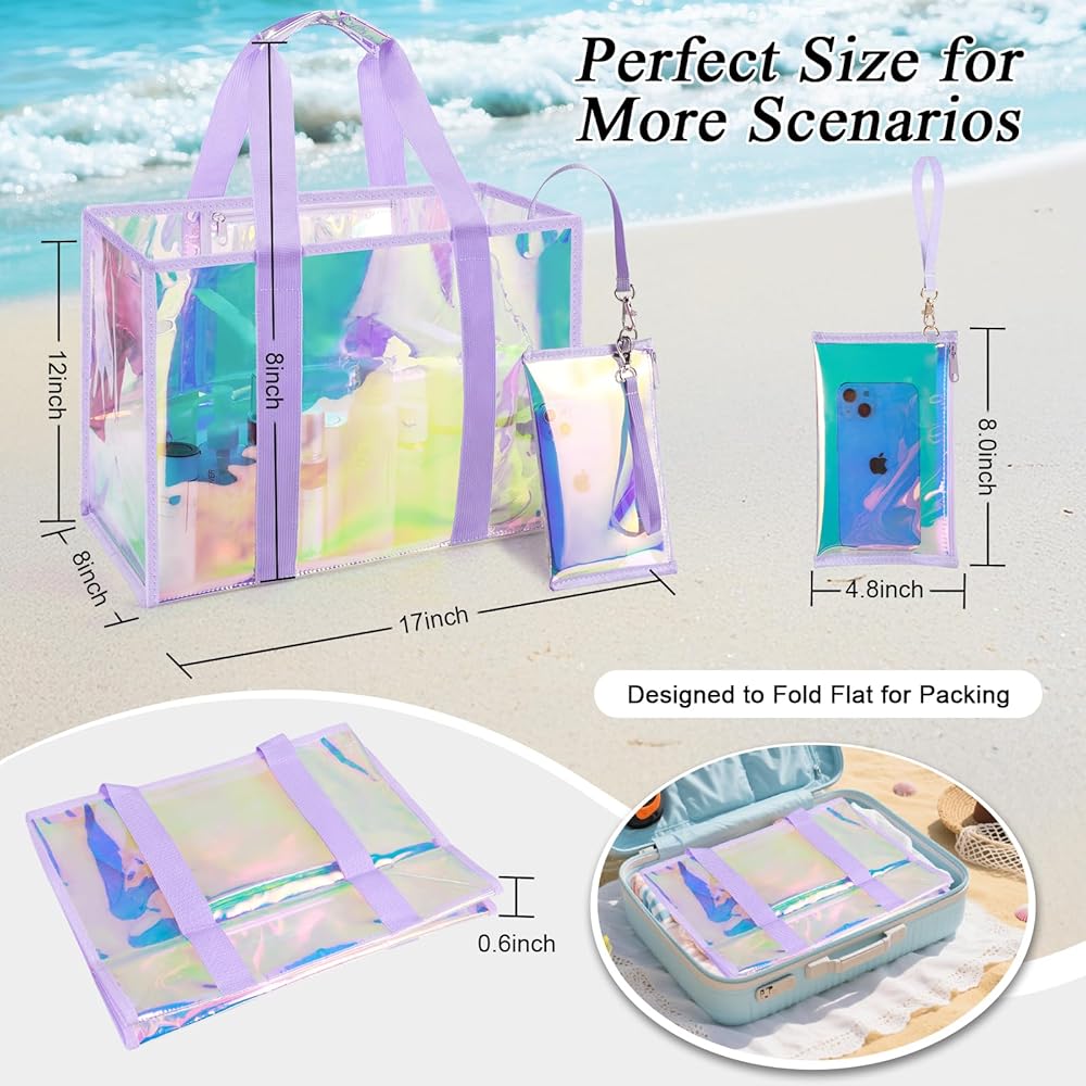 Premium Beach Tote: 26L transparent hauler with TPU material (3x scratch-proof) for beach/pool/cruise trips. Features sandproof & waterproof seals, crease-free folds (80% smaller packed), and holographic sheen—where fashion meets function. Smart Adventure Tote: 26L XL beach bag holds 3 towels + 6 drinks & essentials. Tip-proof base + widened straps stay upright on sand. Folds palm-sized—stashes in purses/car doors, beating bulky coolers. Multi-Scene Versatility: From beach trips to pool parties, cruise vacations to gym workouts—sand-proof base + quick-drain vents + fold-flat design adapts effortlessly. Real-Life Ready: Details That Deliver -- Waterproof Phone Pouch Touchscreen works through waterproof shield. All sizes fit. -- No-Loss Interior Zippered waterproof pocket + clip-on key leash. -- Earth Armor TPU 3x scratch-proof. 90% returns to earth. Unbreakable Joy Guarantee: 365-Day Adventure Shield: Hassle-free replacement if scratches or damage occurs