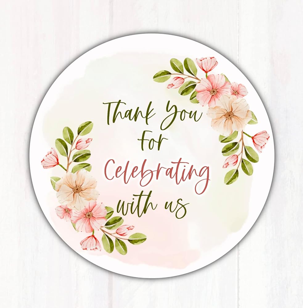 ملصقات مستديرة مقاس 5.08 سم شكرًا لك على الاحتفال معنا لاستخدامها في هدايا الزفاف، أو حفلات الزفاف، أو حفلات أعياد الميلاد. تم تصميم الملصق بخلفية مائية وتصميم زهور نابض بالحياة.