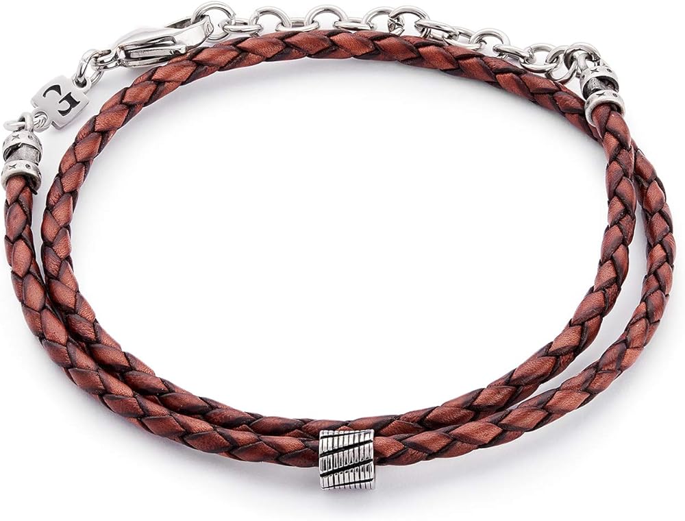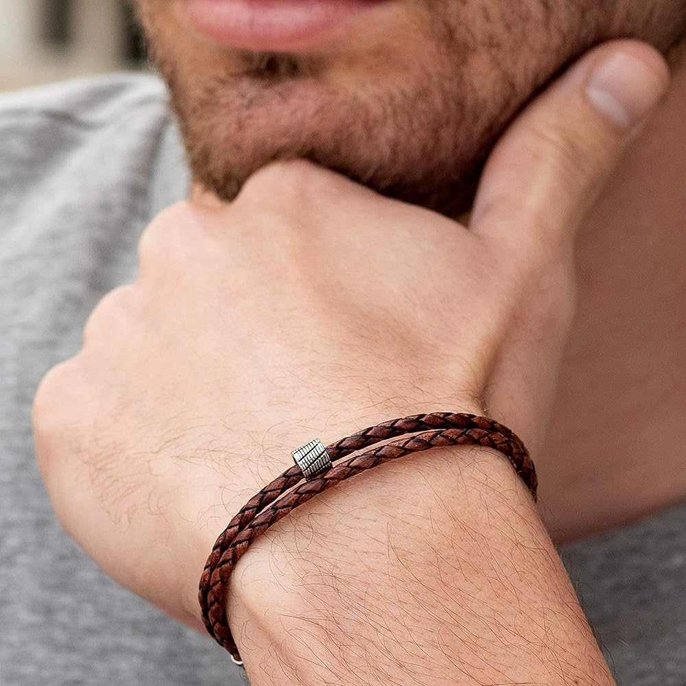 سوار من الجلد مصنوع يدويًا للرجال - سوار من الجلد الطبيعي المضفر باللون البني للرجال مع خرزة مطلية بالفضة - 14.5 بوصة