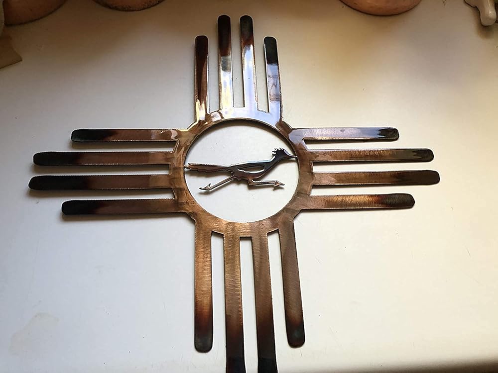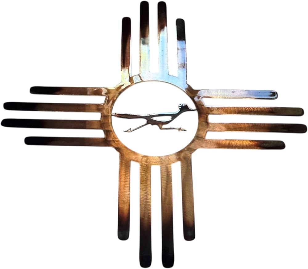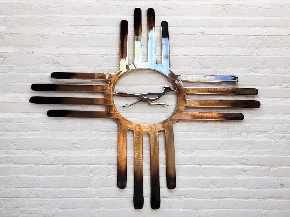 Add a bit of southwest flair to your home or office with this handcrafted piece featuring a Zia with a roadrunner depicted in the middle. This piece will brighten up any room to display your culture in a tasteful and beautiful way. This piece is 100% handcrafted in the USA. Finish: Copper/Bronze Plated and clear coated. Measures approx 40" x 40" Note: Saw tooth hanger welded on the backside to aid in hanging Each sculpture is a one-of-a-kind piece because of the random surface finishing that catches light from different angles and the coloration technique which is achieved by heating. This causes the vibrant natural colors of steel to form resulting in a unique piece of art each time one is created!